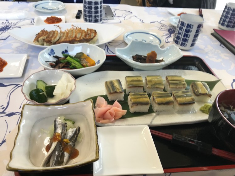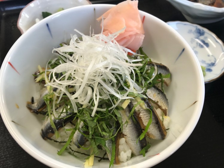 お昼はイワシ専門店に。私はイワシの漬け丼。この上なく美味。最初の写真は友人が食べたイワシのバッテラのようなひしこ押し寿司。