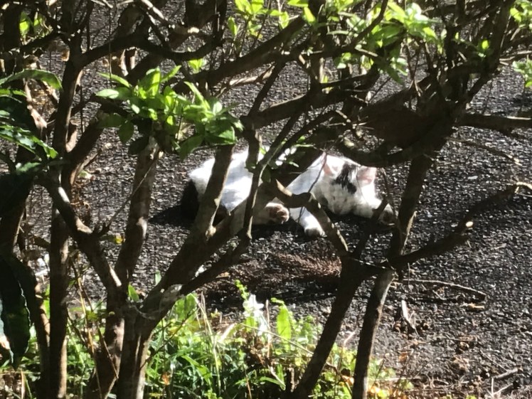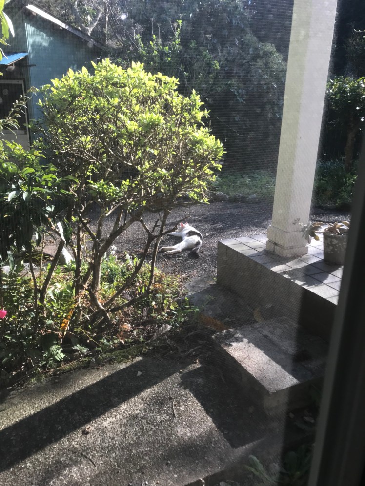 今日は天気が良いのですが、朝から館山の家でパソコンに向かっています>_< ふと目を庭にやると窓越しに口にまだ動く小さなトカゲをくわえた猫ちゃんが!後ろを向いて食べ終わった後、お日様の当たる所で気持ち良さそうに居眠りを始めました。