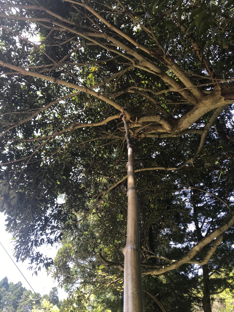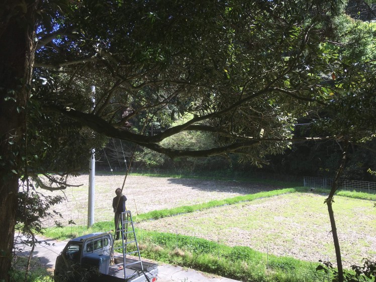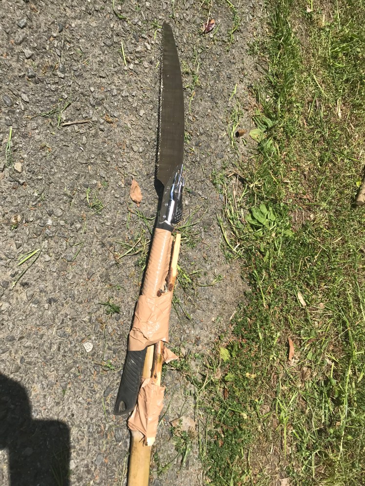 先ずは高所作業用に、竹竿にノコギリをガムテープで固定したツールを自作。