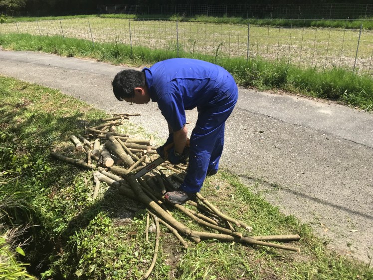 切り落とした大きな枝葉から葉のついた部分は燃やして処分するために集め、太い部分は薪用に適当な長さに切り落とします。仲間のチェーンソーが大活躍。一人でノコギリでやってると日が暮れても終わりません。