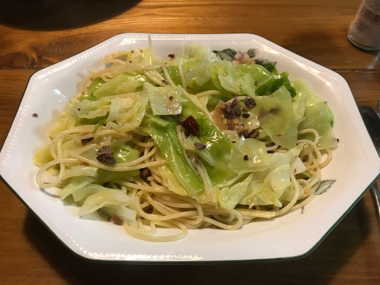 娘夫婦と過ごすGW、2日目の夜は先日ロンドンのスーパーで買い溜めしてきたアンチョビの缶詰を使い、地場のキャベツを使ってパスタ。材料はほかにニンニク、オリーブオイル、鷹の爪。