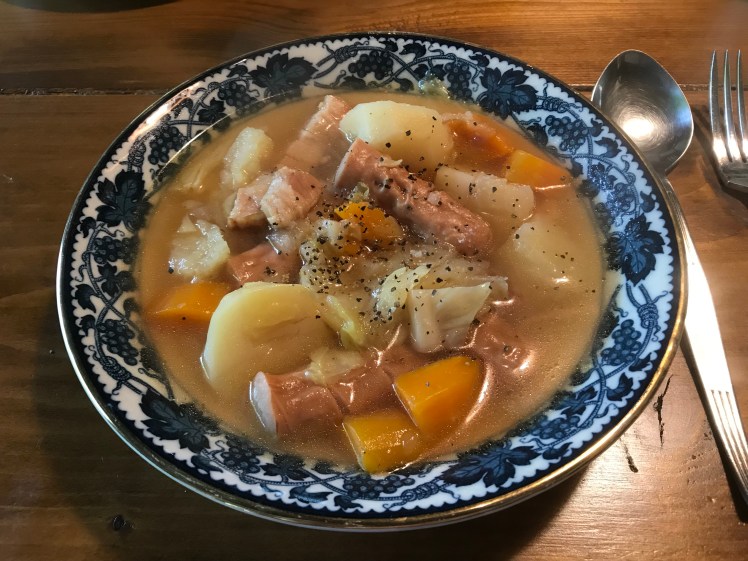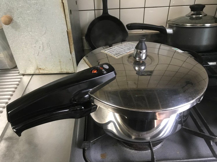 翌朝はキャベツの残りに地場の人参、ジャガイモ、新玉ねぎ、ベーコン、ウィンナー、チキンコンソメを材料に圧力鍋でポトフ。とても柔らかくお腹に優しく、野菜成分がたっぷり出て美味。