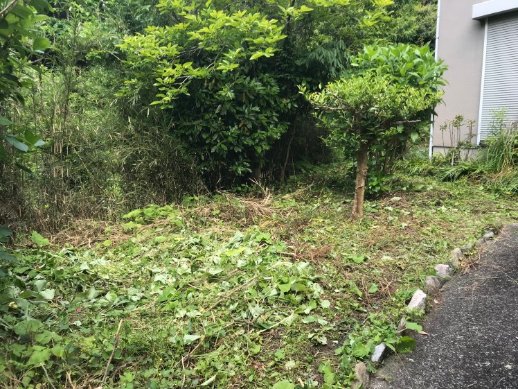 一昨日、イベントで使った芝生が廃棄処分になると言うのでイベントが終了した夜、一部を車で取りに行って、昨日、庭の一画に敷いてみることに。現況はフキが生い茂るなど荒れた状態で先ずは刈り払い機で草刈り。