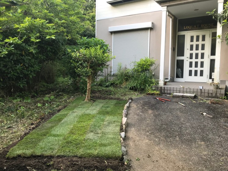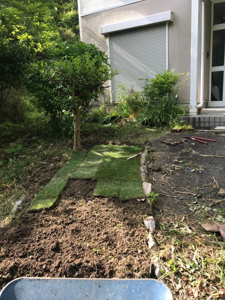 少し傾斜があるので、敷地の別の場所から土を採取して土盛りし、芝を敷いてみました。