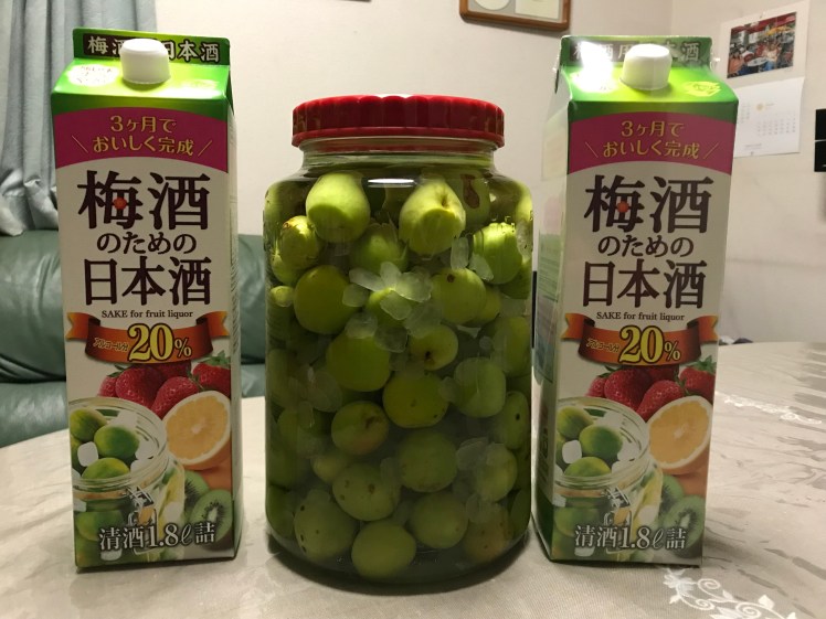 今日、3.4kgほどの梅が採れ、2kgはネットで仕入れておいた「梅酒のための日本酒」で仕込み。ホワイトリカーより味がまろやかになるのでこれを取り寄せています。