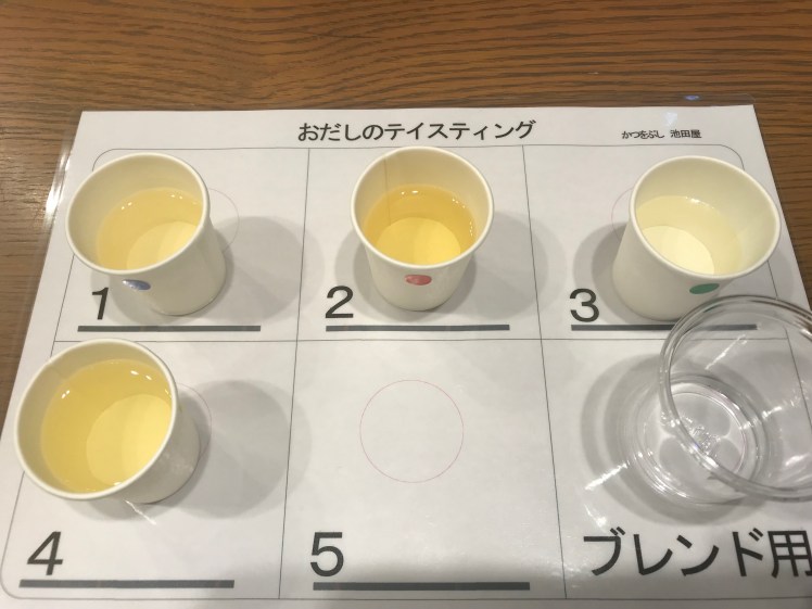 鰹節の説明から始まって、鰹だし、そーだ鰹だし、鯖だし、それぞれとブレンドのテイスティング。ほんのちょっと鯖だしを加えるだけで味がまろやかにグッと変わったり。