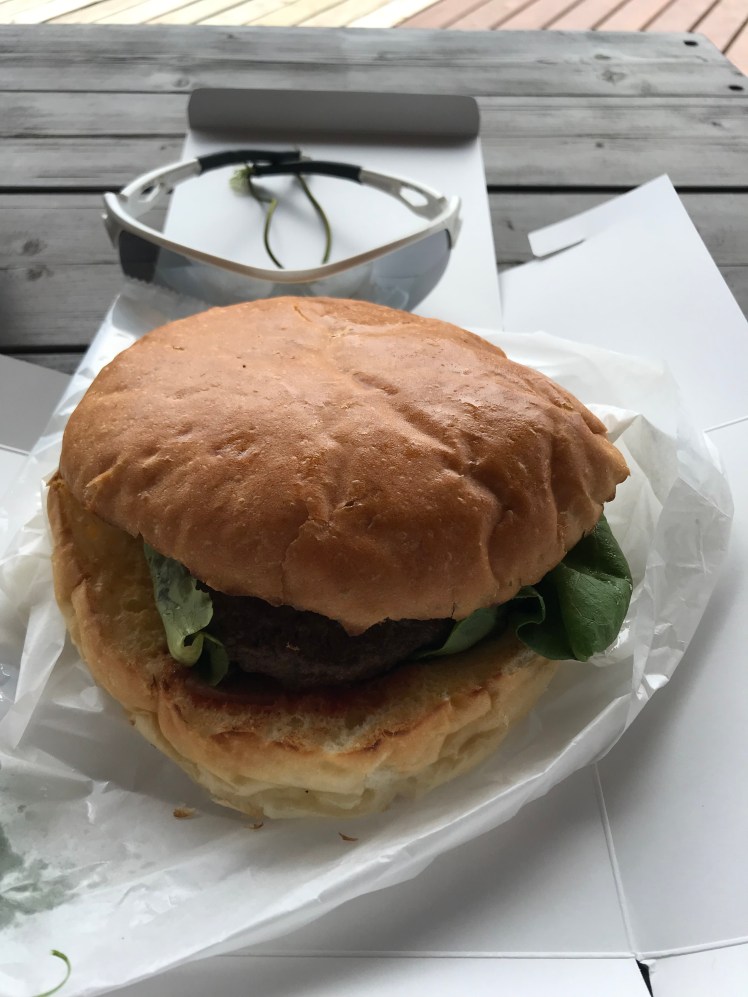 後ろにおいてあるサングラスと比べて下さい。その大きさが分かります。和牛100%ビーフでバン(パン)も美味しい。今日はアボガドバーガーを頂きました。