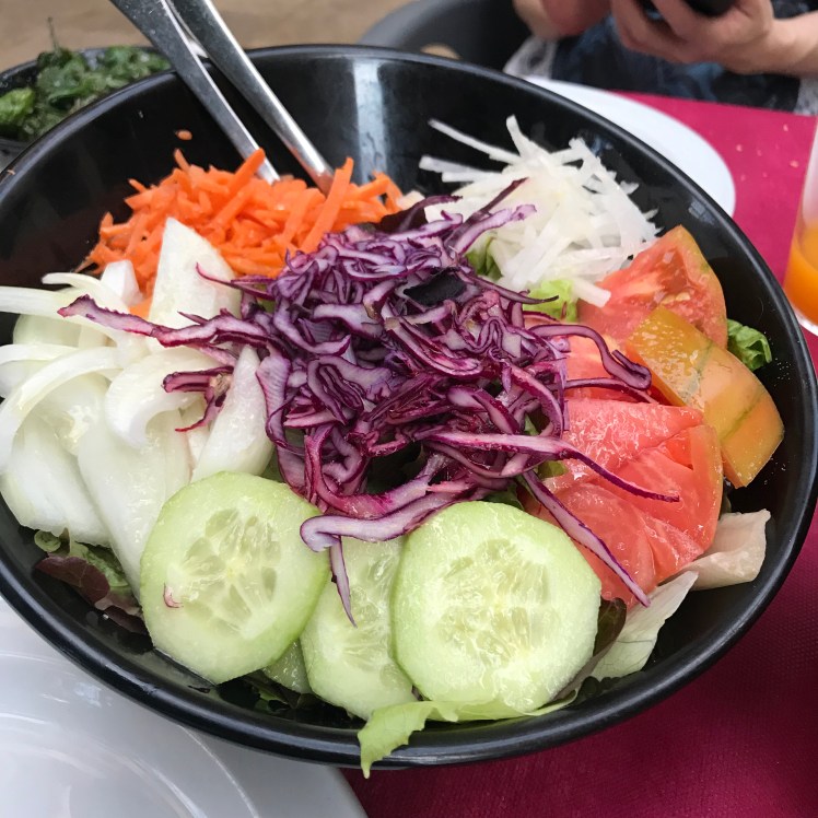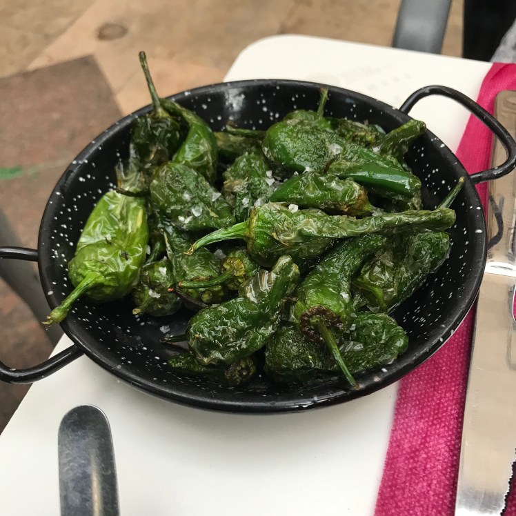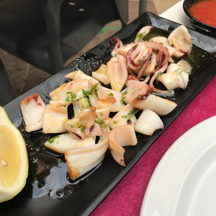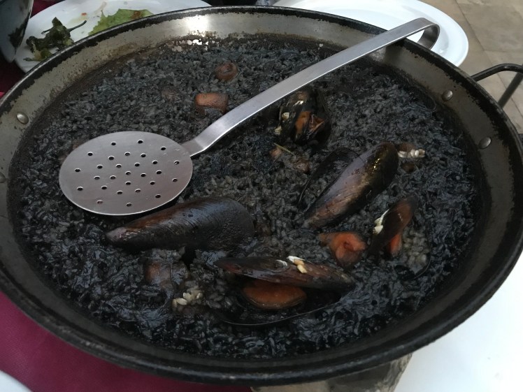 早速、生野菜不足だったのでサラダをお願いし、それに新鮮なイカを軽く炒めてオリーブオイルなどで仕上げたもの、獅子唐の唐揚げ(ピメントス・フリートス)、そして、イカ墨のパエリア。お昼に食べたものとは別物のパエリア。どれも美味しい。