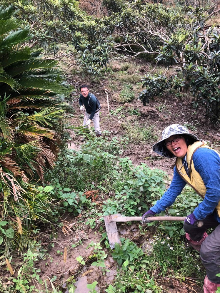 昨日は友人からの連絡で台風で荒れたビワ畑の整備のお手伝いに。担当したのは水路の整備。手掘りで水の道を作り畑に溢れないようにします。
