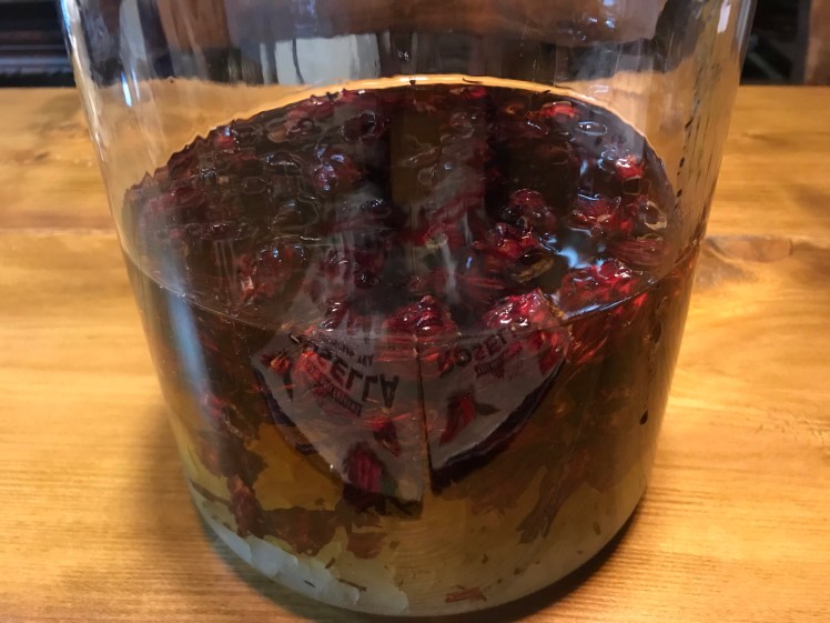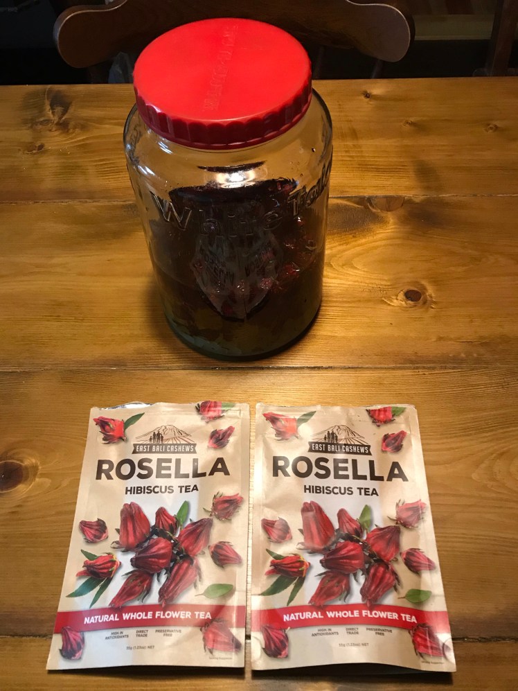 先日インドネシアに出張に行った際、スーパーでハイビスカスティーを二袋買ってきたのですが、ブランデーに漬けてみることに。ハイビスカスはビタミンAやCやEを多く含み、目や疲労回復、美容など効用が多彩と言われます。どんな味になることやら。