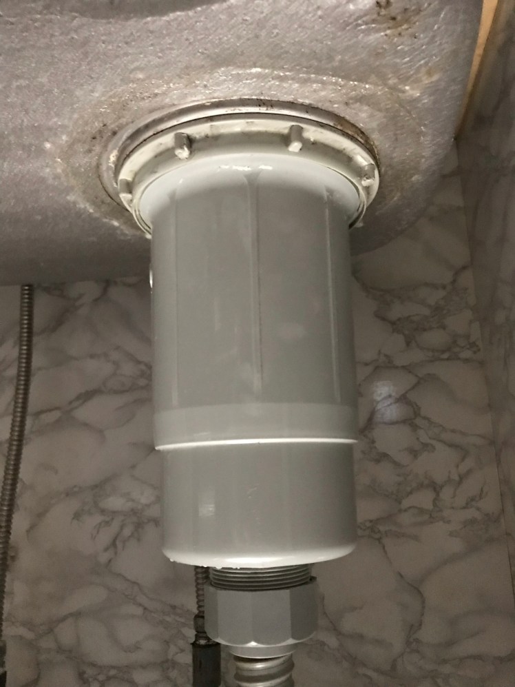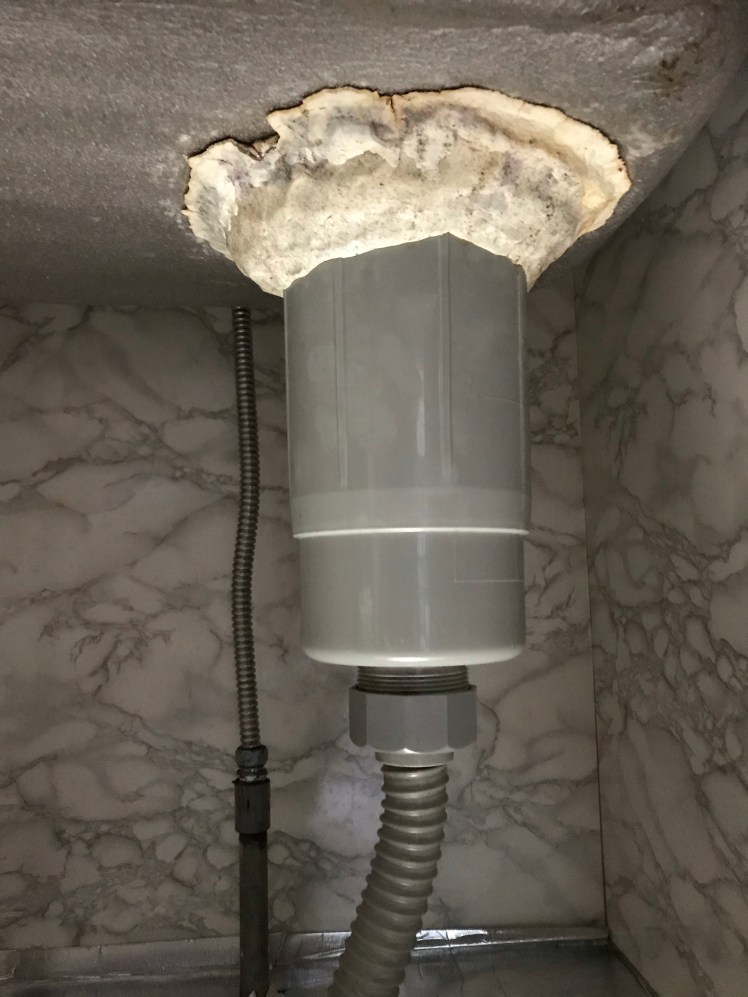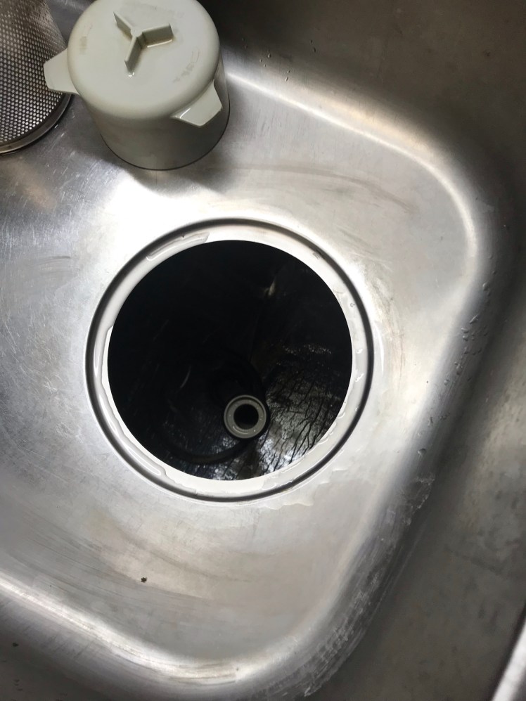 そして、もう1箇所、キッチンの排水口の裏から最近、水が漏れているのに気付き、裏側を見たら、前のオーナーが漏れる箇所を覆うように何かを被せていたものの劣化でまた漏れ出したよう。