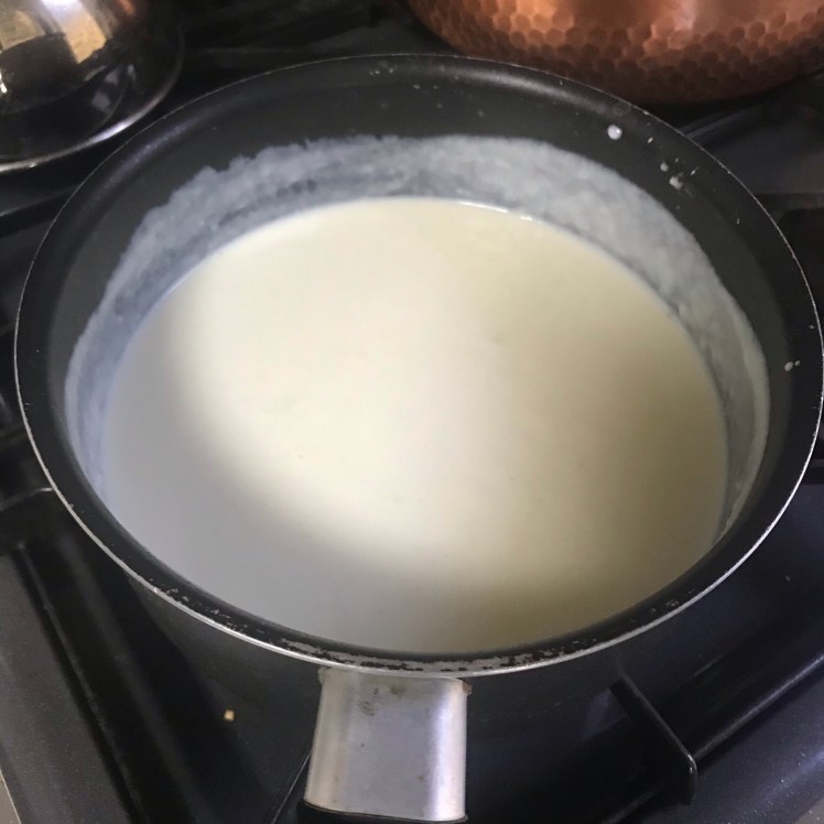 カリフラワーは茹でた後、牛乳入れてミキサー掛け。