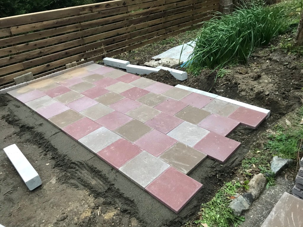 先週ある程度整地した上に砂を敷いてその上にタイルを敷き詰めていきます。水平器を使いながら。