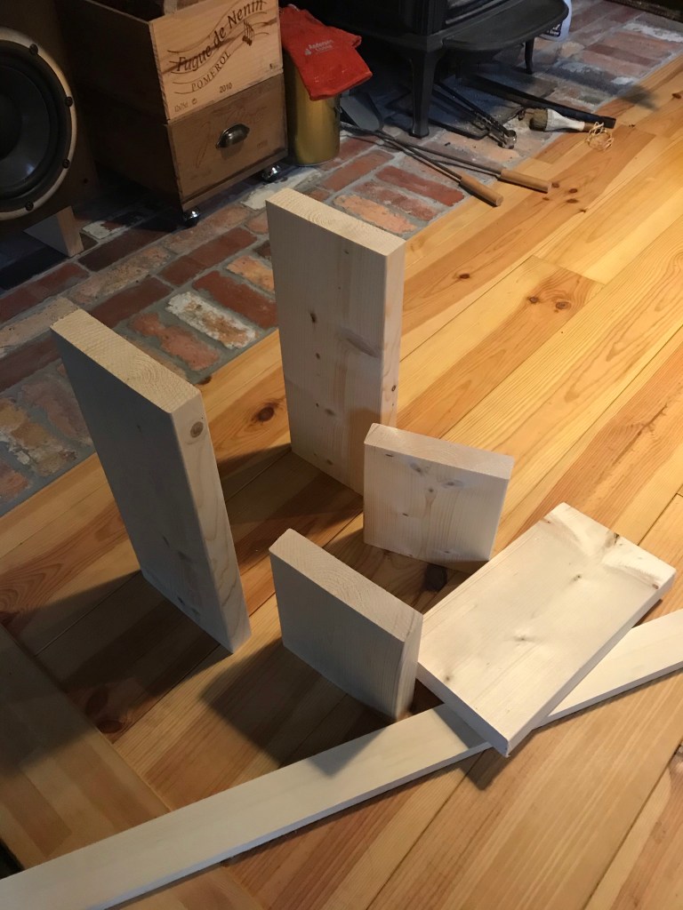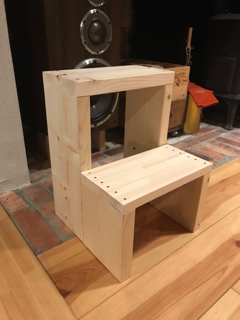 今日は雨で外の作業が出来ないので、長さ90cmの板2枚を購入し(計1,800円)、家にある端材も活用して踏み台製作。