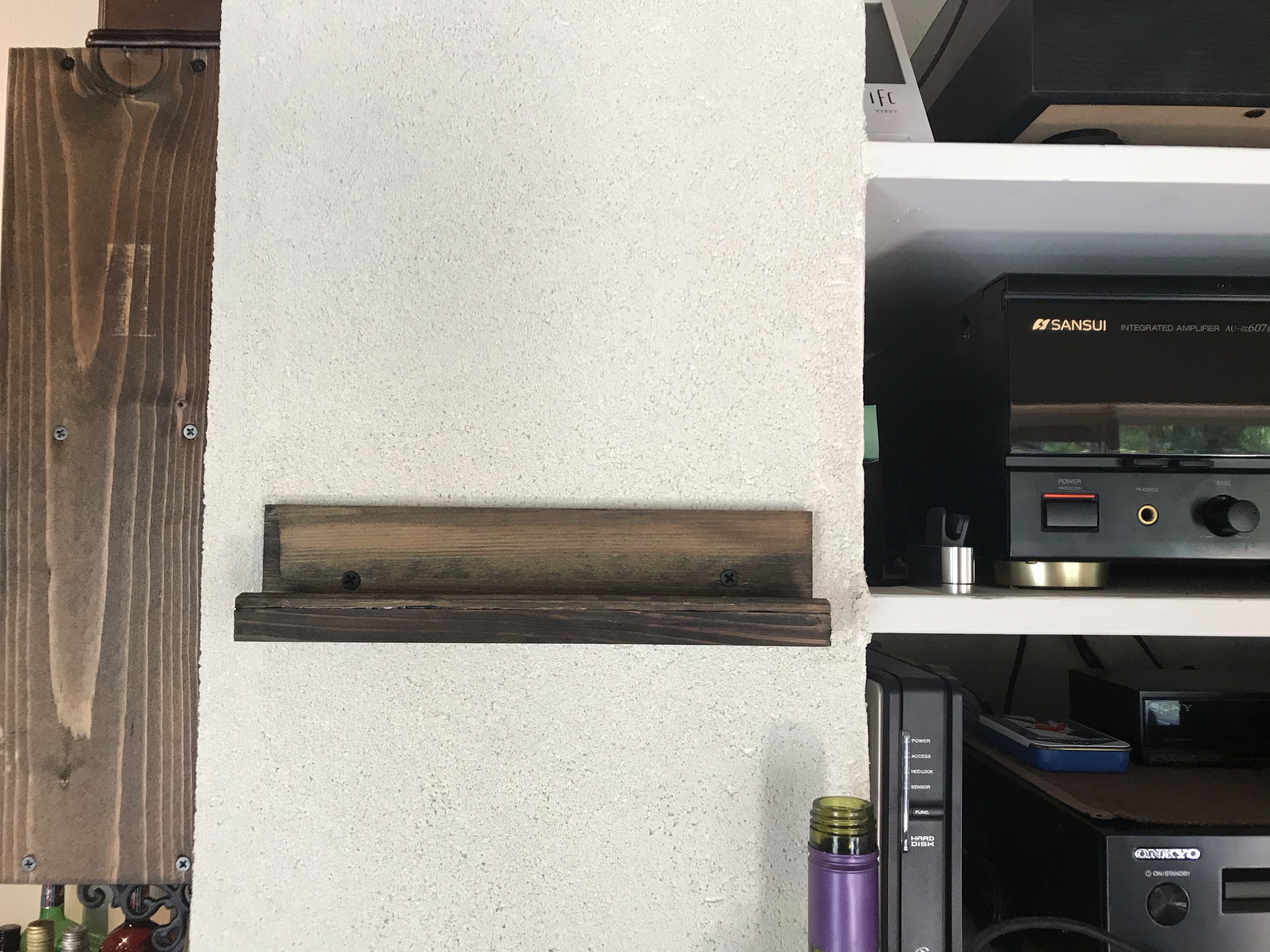 掛けているレコードのジャケットをいつもその辺に置いていましたが、壁に飾って置けるような壁掛けホルダーを家にある端材で製作。