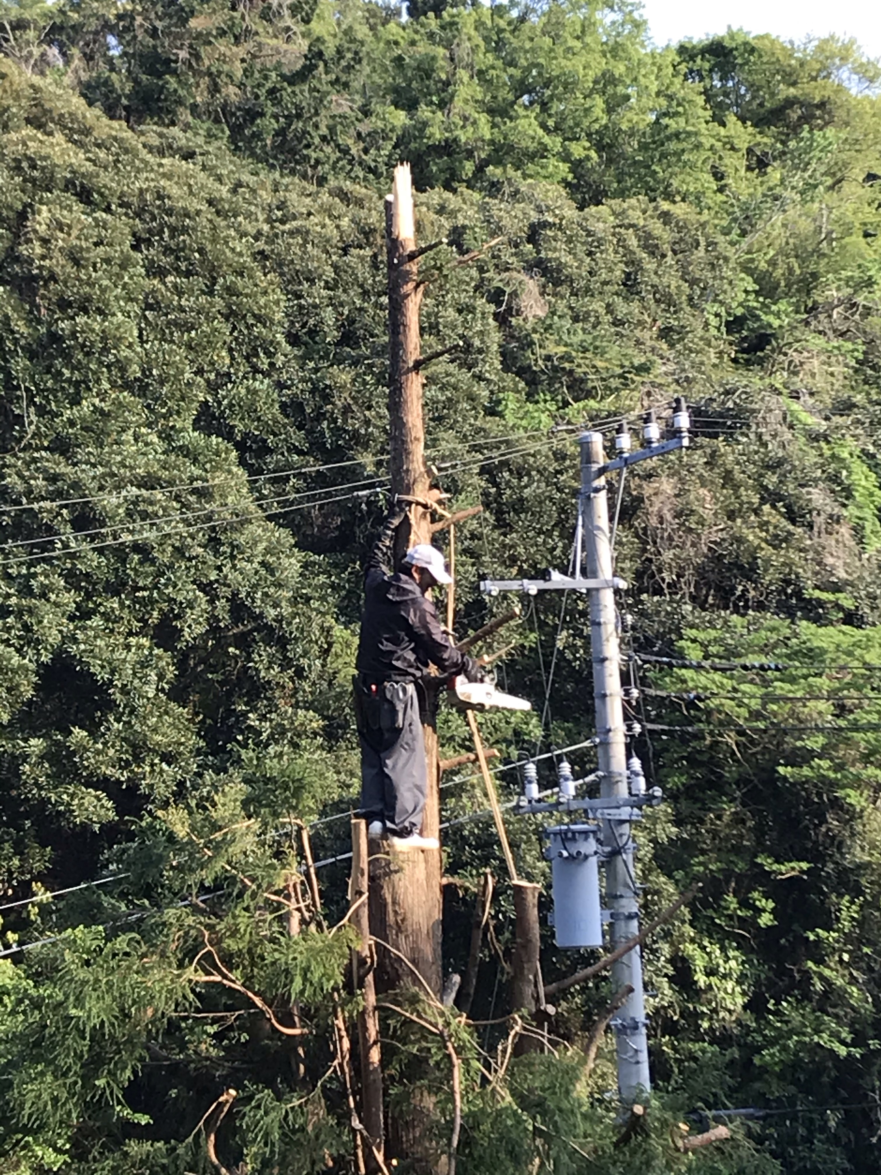 さすが職人さん。途中でバッサリ切ると周りの電線に倒れ込むので少しずつ、下に落下しないようにロープで縛り、伐採。