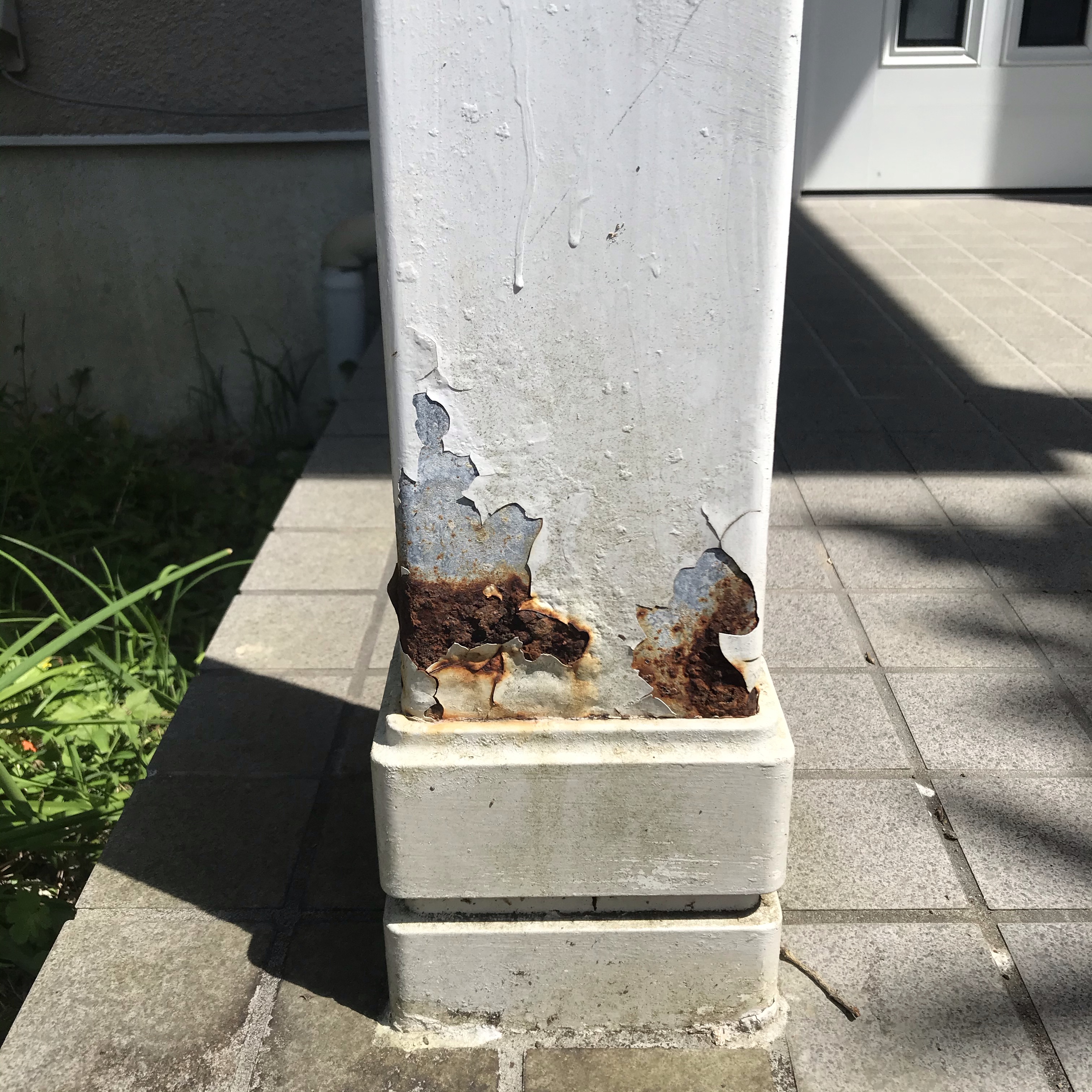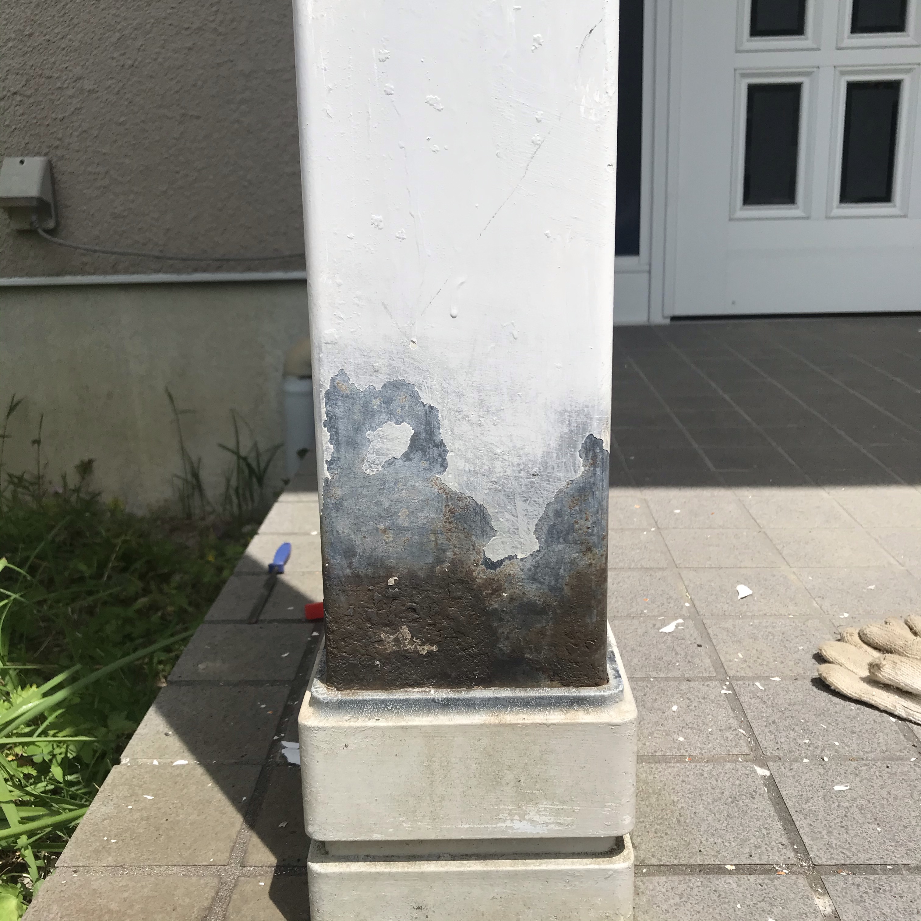 玄関の柱の根本がペンキが剥げ落ちて錆が進んでるのが気になってはいました。なかなか手を付けられず、ようやく今日、作業することに。4面こんな感じです。