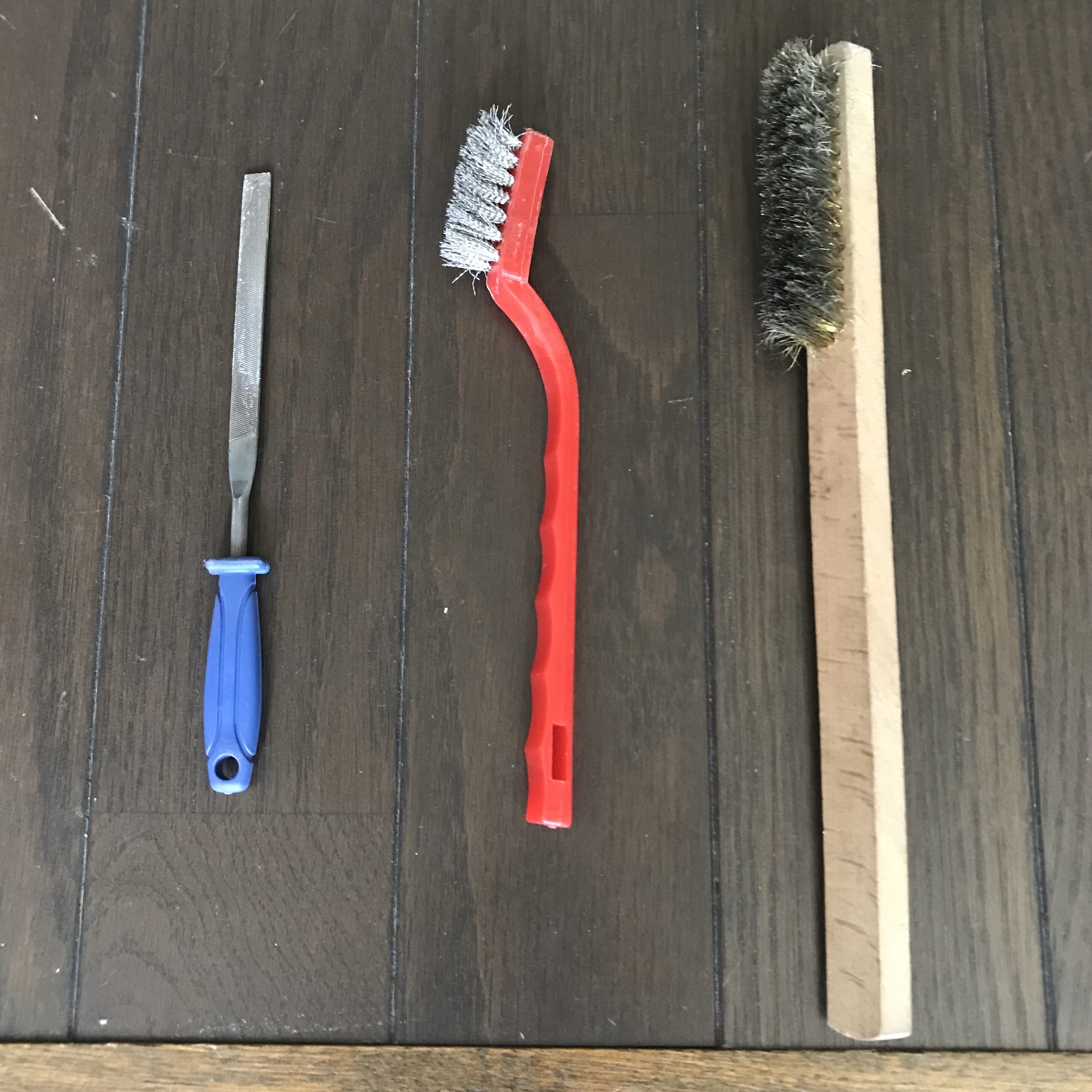 サビを落とさないといけないので家にあるこちらを使いました。かなブラシとヤスリ。
