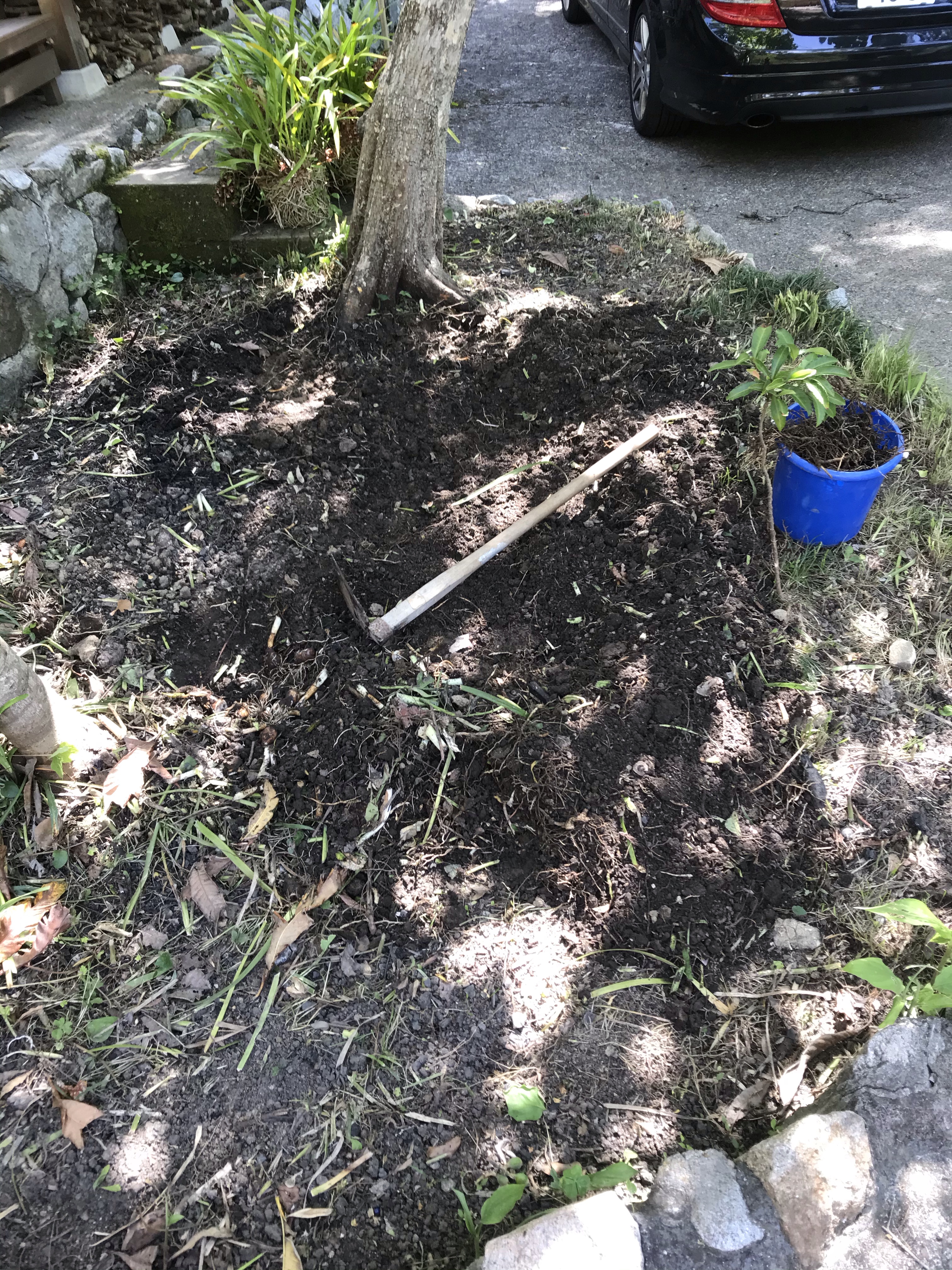 先週、取り敢えず草刈りをして綺麗にした柿の木の下。家を購入してから5年、ずっと放置していたので色んな植物がところ狭しと入り乱れていて、特に水仙系の長い葉っぱが大部分を覆う状態で手の付けようが無かったので一旦ほぼ全て耕してリセットすることに。