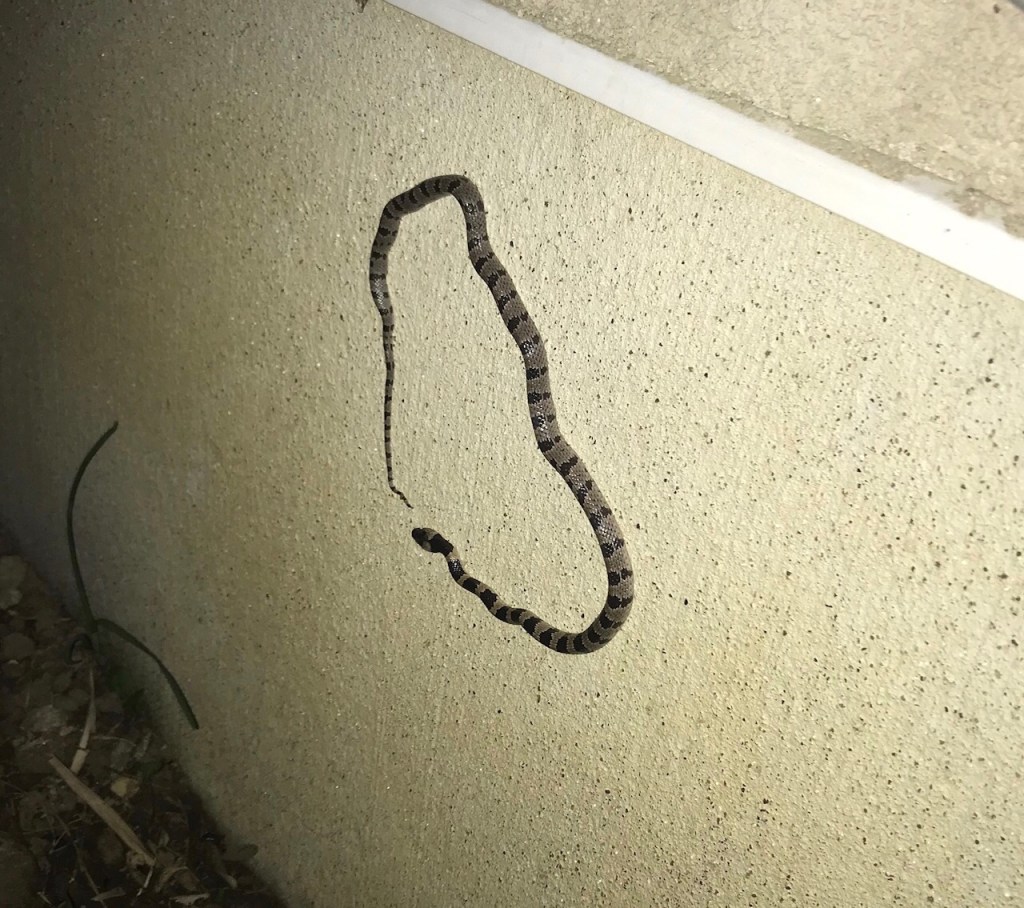 写真を撮ってネットで調べてみるとシロマダラと言う小型の毒を持たない蛇で見つかるのは非常に貴重だとのこと。虫などを食べてくれるし特に人間には害を及ぼすものではないのでそのままでお別れしました。またいつか会えるといいね。
