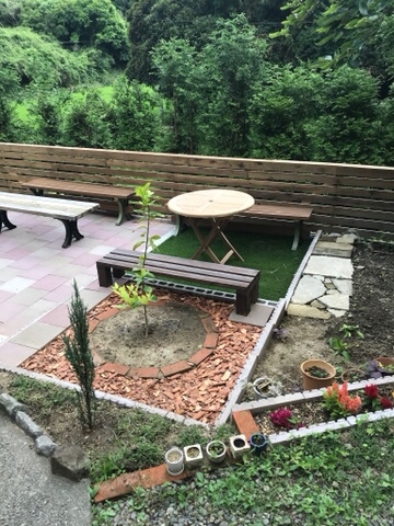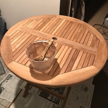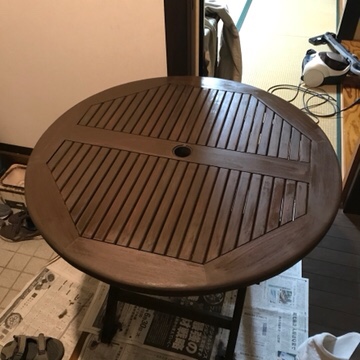 庭が直線で仕切られているので丸いテーブルを探していたのですが、コメリで木製の程よいものがあったので買ってきました。最初は鉄製のものを探していましたが、将来、木製であれば処分もしやすいので。