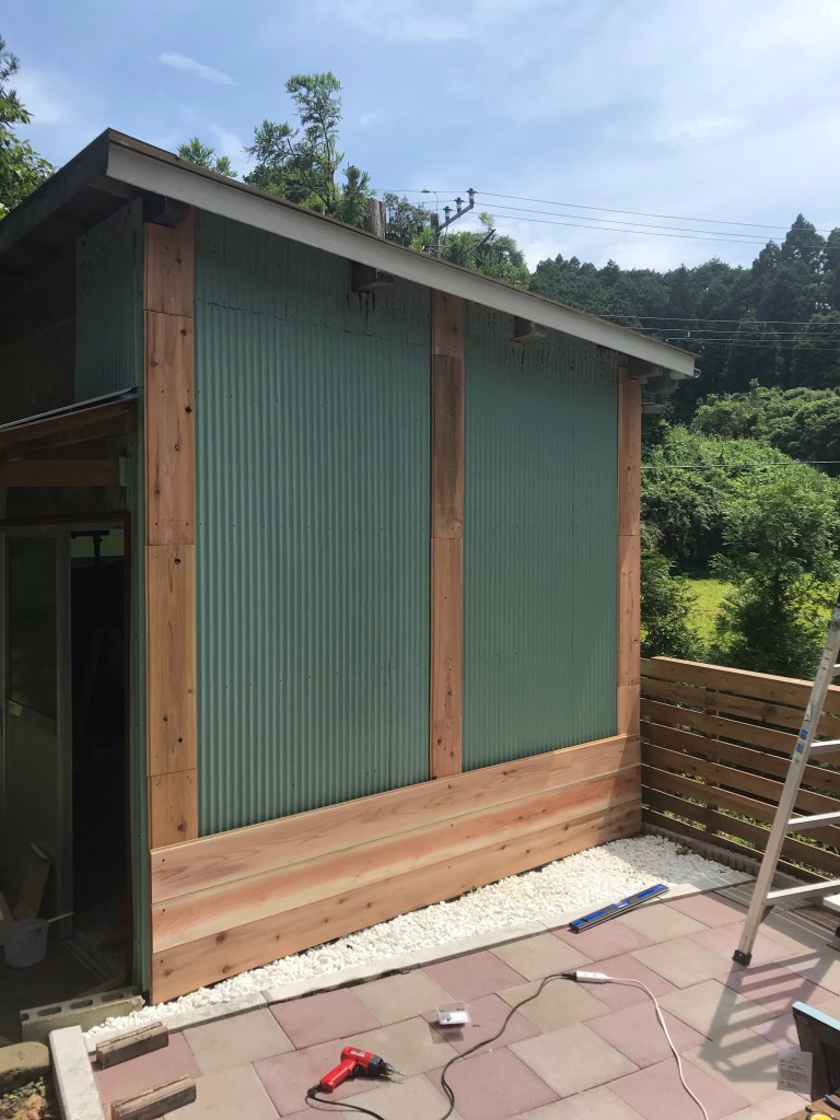 先ずは端材で縦板を打ち込み。釘と釘を一旦打ってトタンに穴を開けた後、抜いてネジ留め。