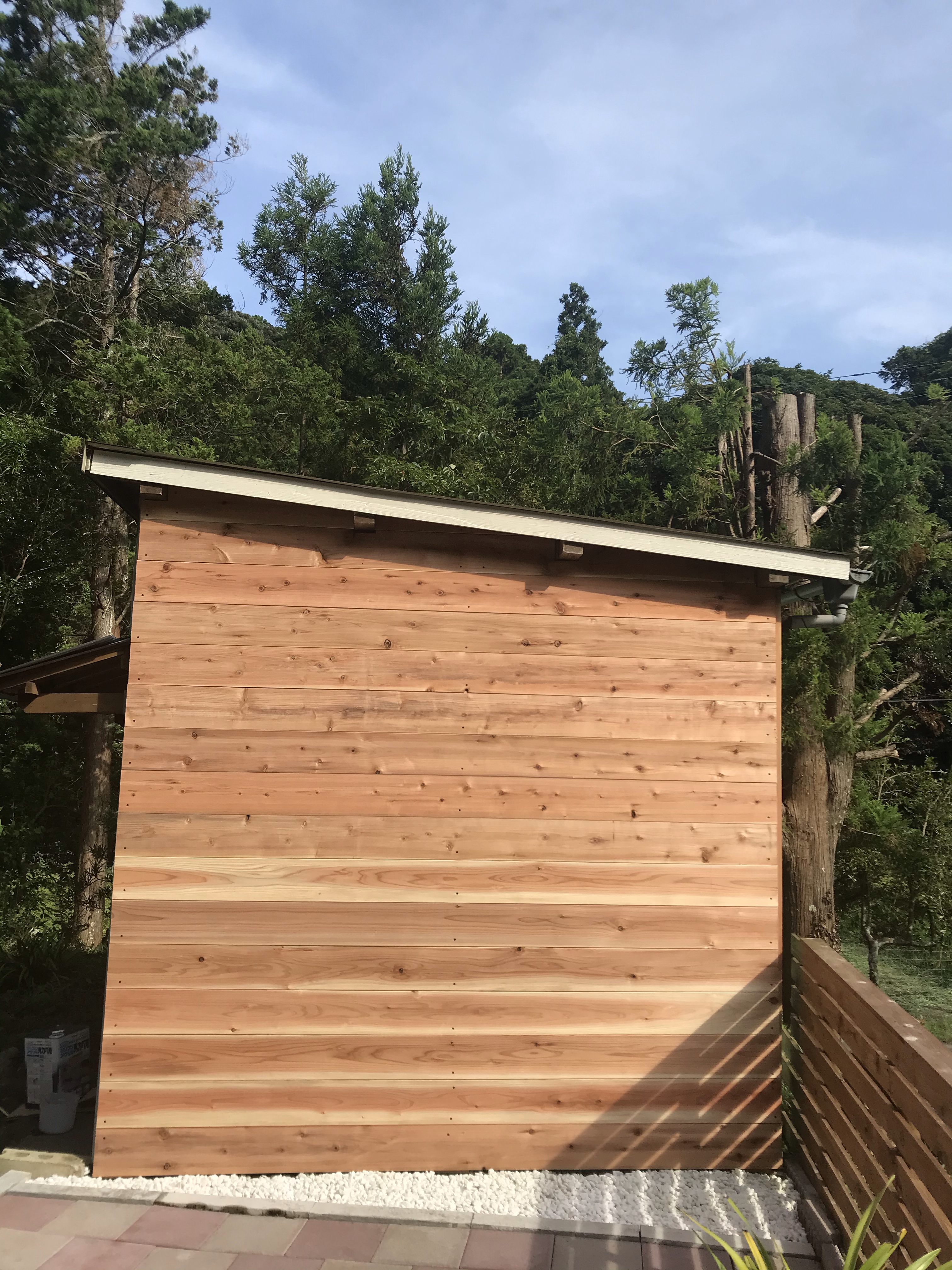 庭の整備を進めているうちに横にある物置の壁が気になって板打ちにしようと考えていましたが、今日、実行。知り合いの木材屋さんに相談しながら「相ジャグリ」と言う隣の板と組み合う仕様の板を寸法通りに切って持ってきてもらっていました。