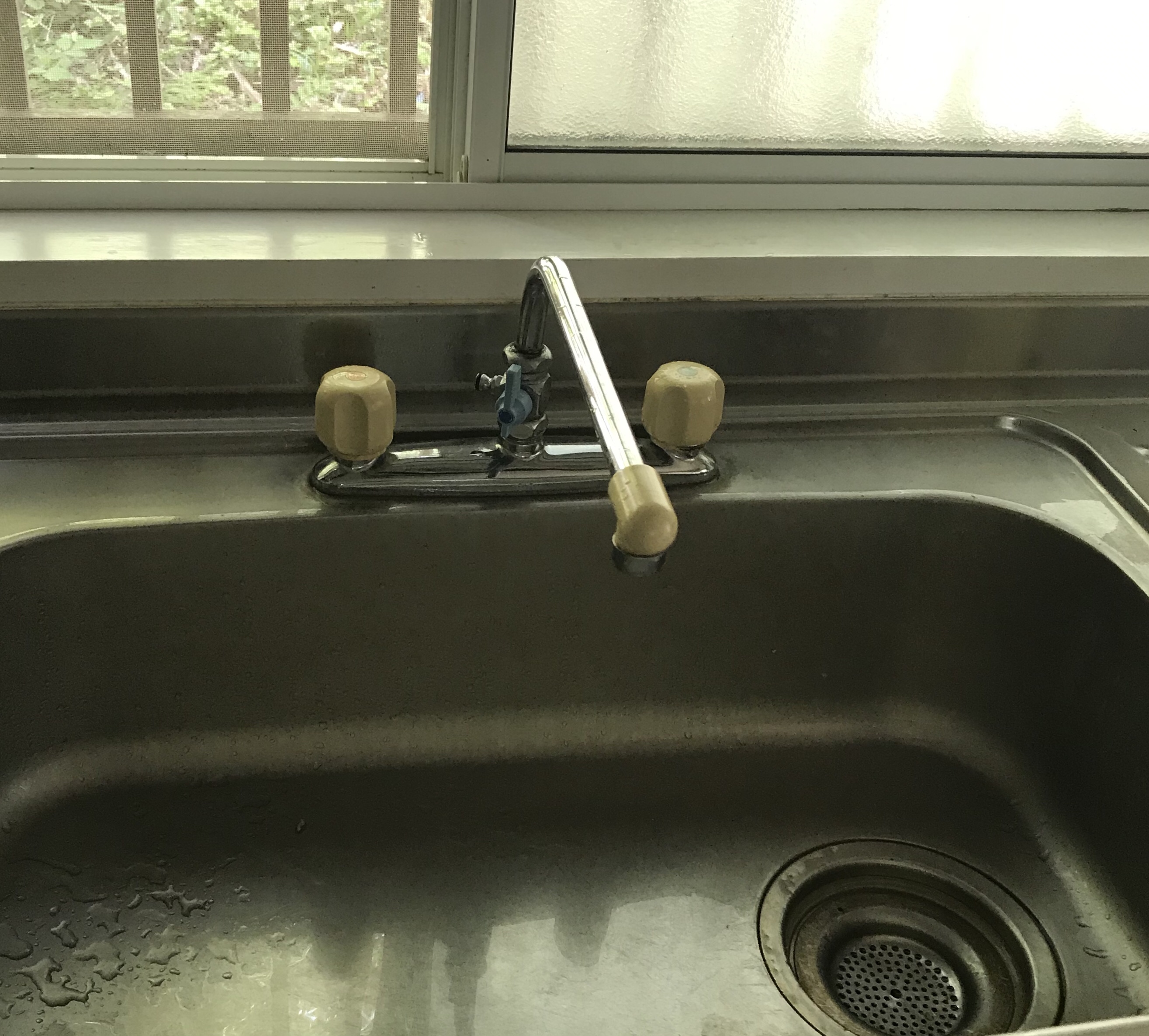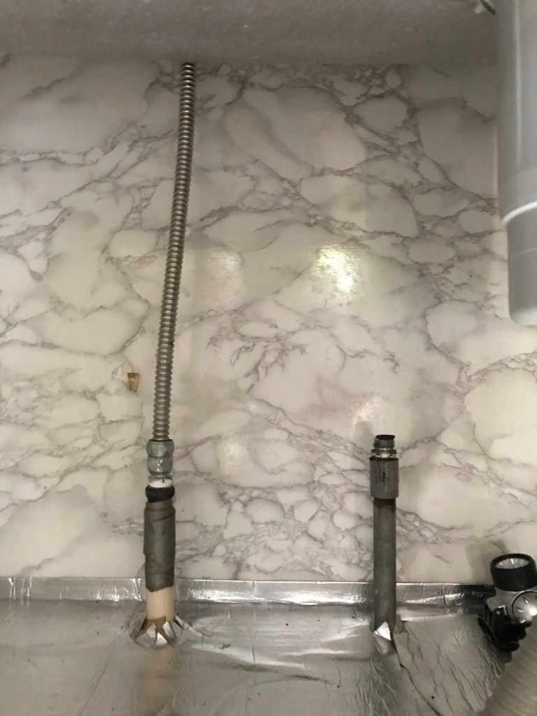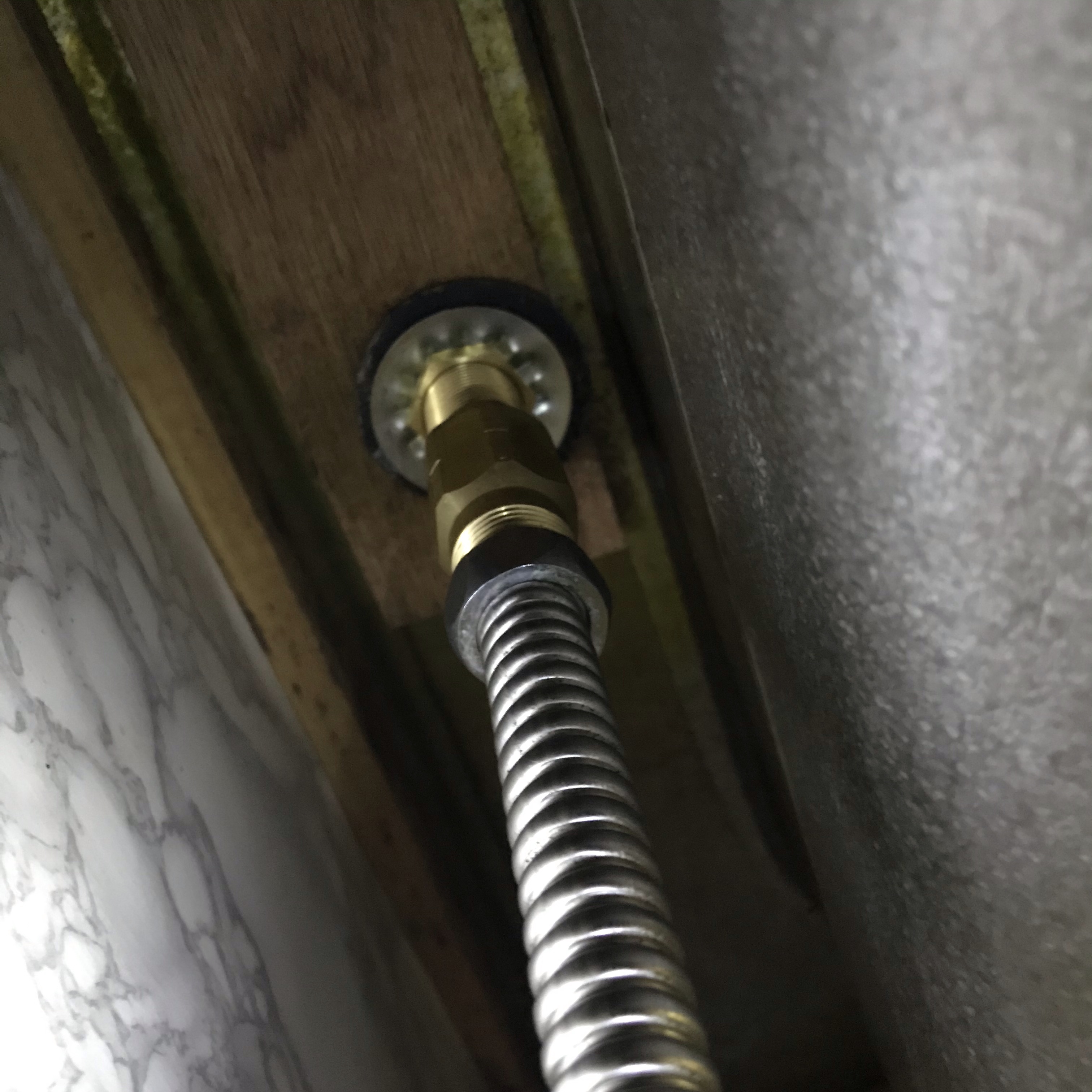 問題は取り換え工事。先ずは水の元栓を止め、シンクの下に潜り特殊な工具を使って既存の蛇口を外す作業。シンクの裏のすごく狭いところで接続しているので作業が大変。