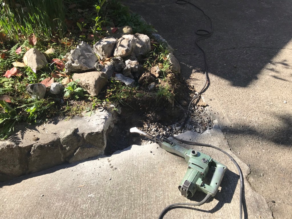 午後、玄関に至る道の幅を拡張するため、以前、友人から借りたハツリ機で花壇部分の石垣を崩していたので拡幅部分にコンクリートを打設することに。