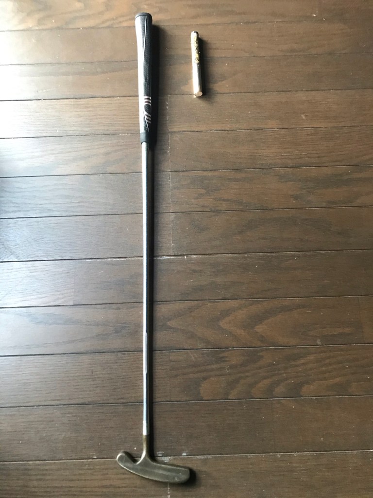 今どき、ゴルフ場で使っている人を見たことがありませんが、パターの原理の基本という意味では貴重な物なので、シャフトを自分に合うように短くし、グリップも自分で交換してみました。
