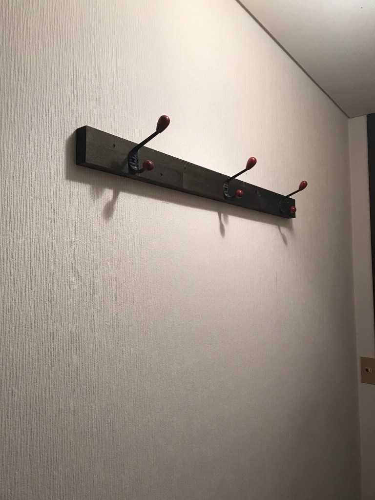 この正月、家内が来た時に「この家には1階にコートを掛けるところが無いのね」と宣われたのが気になって、今般、家にある端材を塗装し、フックを購入して玄関から入って陰になる廊下に取り付けてみました。