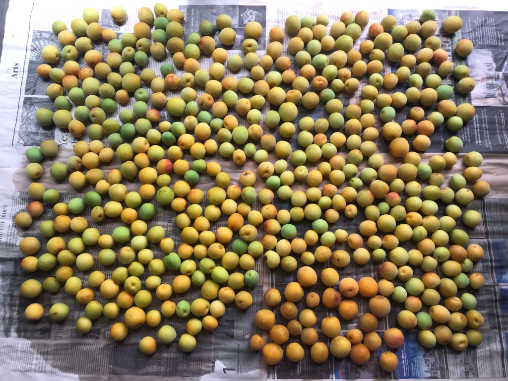 2週間前は青かったですが、今回はだいぶ実が落ちてしまっている状態で採れた実は黄色からオレンジ色になっています。