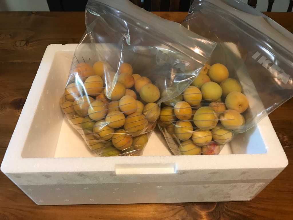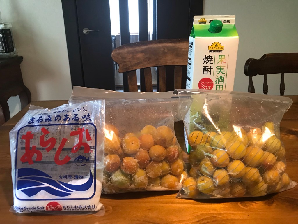 まずは梅干し作り。粗塩と焼酎使いジップロックで。1kgずつ。