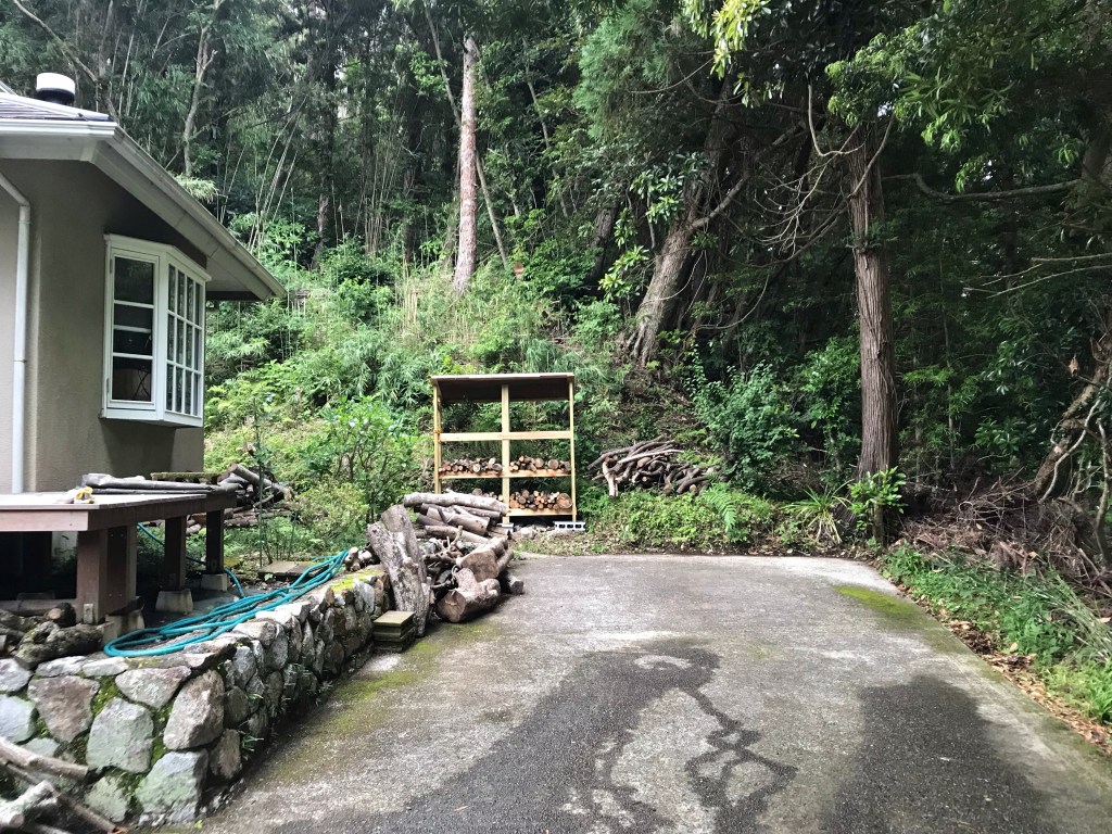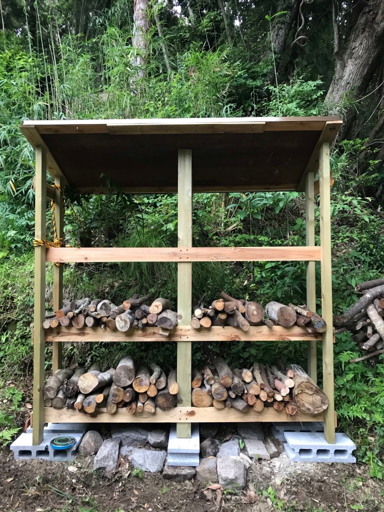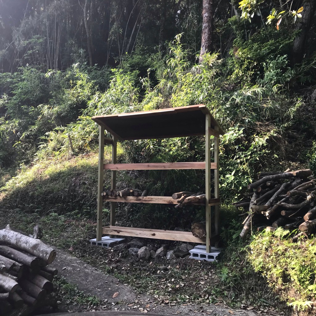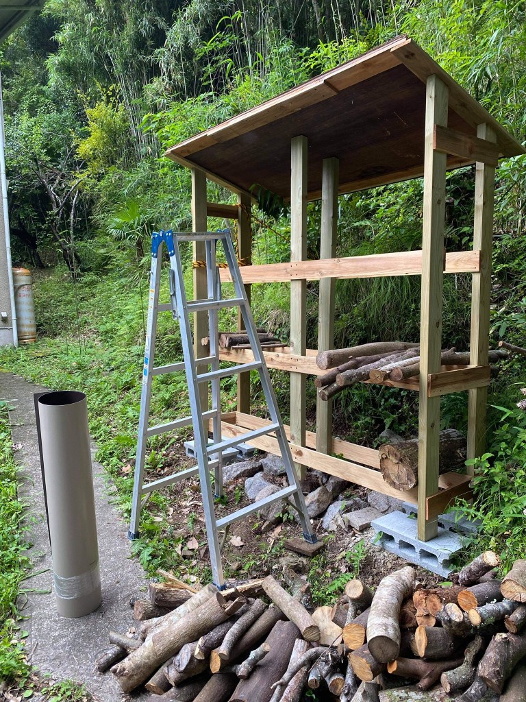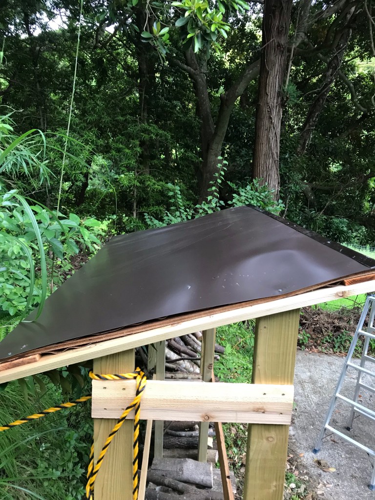 先日、一応、形が出来た薪棚ですが、薪の重さを考えると中央部分にも柱があった方が良いと思われるのと、屋根がベニアで雨ですぐに傷むのでトタンを貼ることに。
