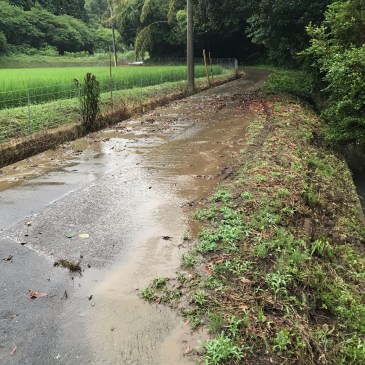 昨日は猛烈な雨。家の前の道路が川のような状態。この写真はだいぶ落ち着いてから夕方撮った様子。 朝起きて小雨の中、土砂を道端に寄せる作業。 家の周りは綺麗にするのが集落の一員としての勤め。