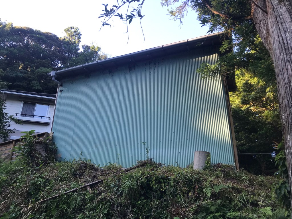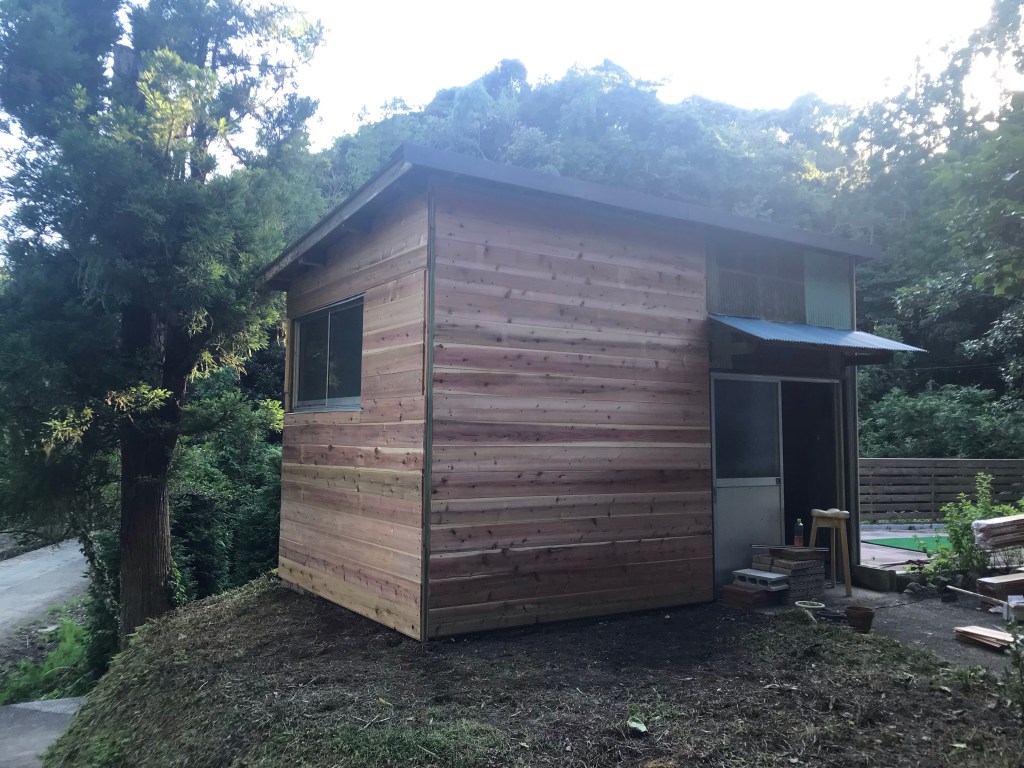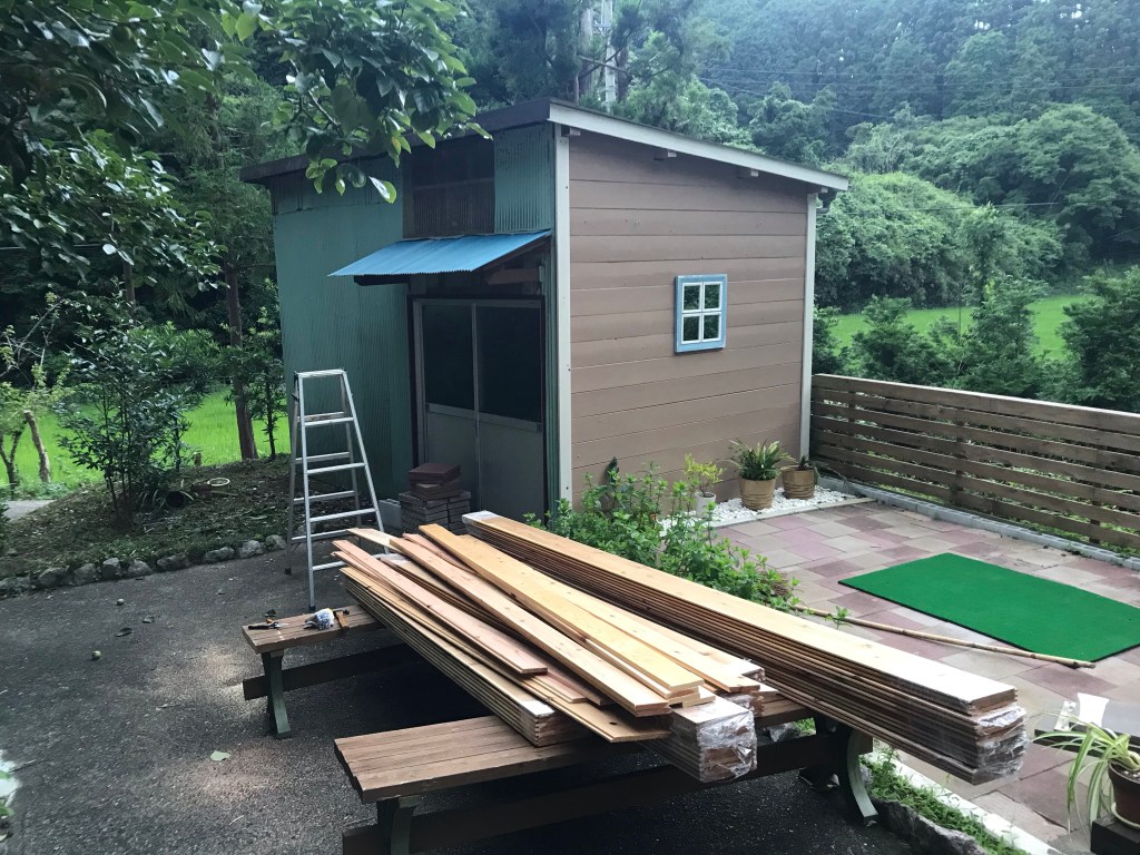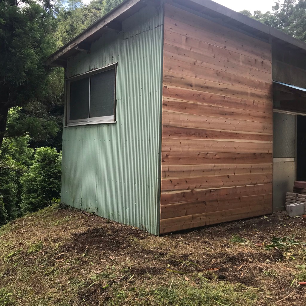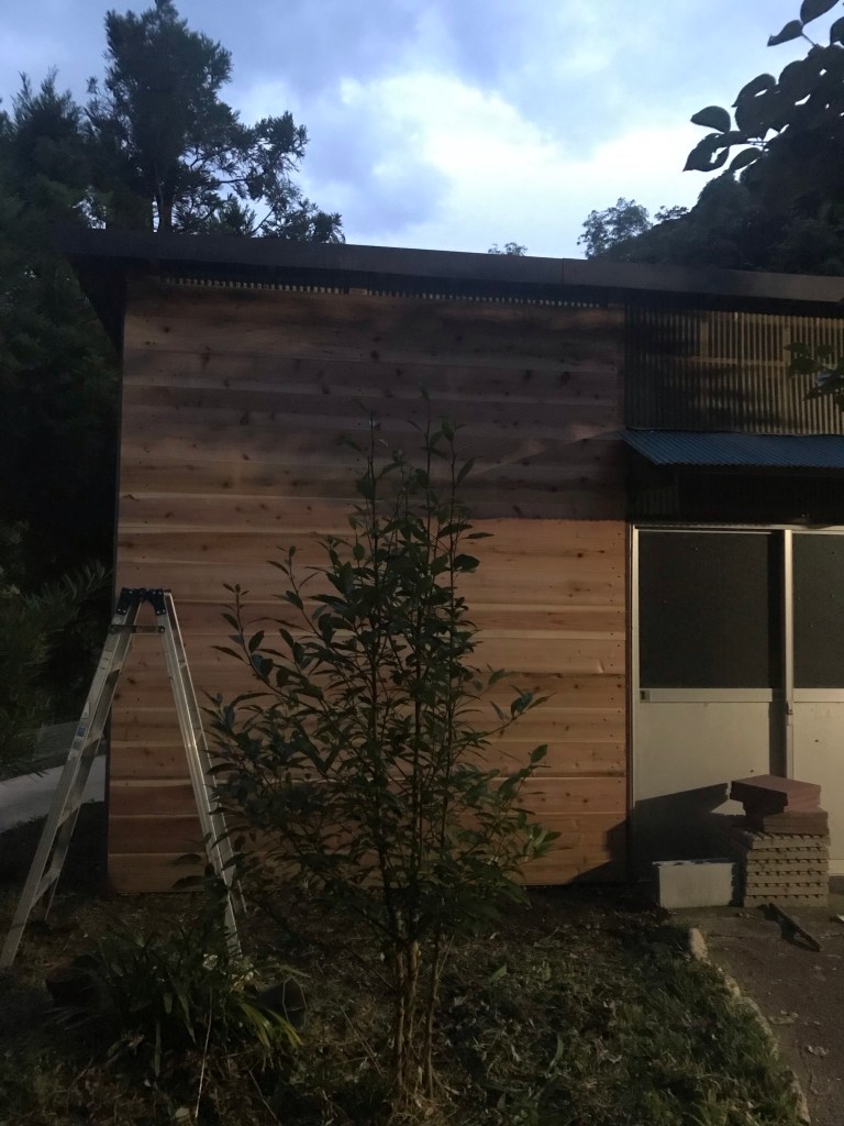 昨年、BBQガーデン側一面だけ板張りを済ませた物置きの化粧直し。