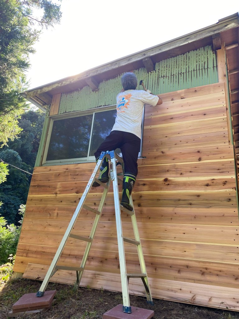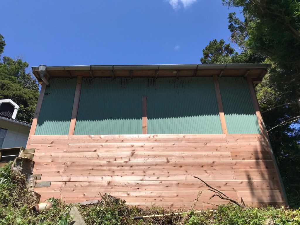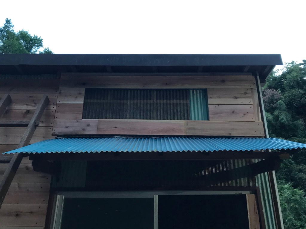 これで大きな面は終わりましたが、入り口扉の上がまだ残っててハシゴで上がって作業完了。真ん中の空白は明かり取りなので後で透明のエンビ板に貼り替えます。