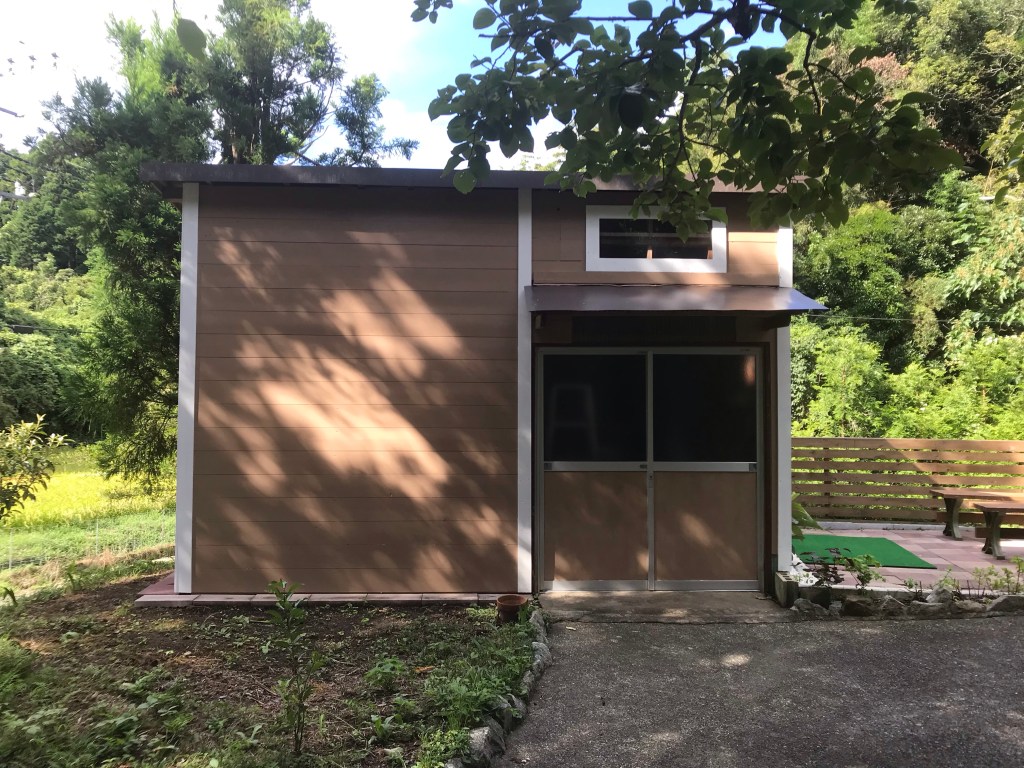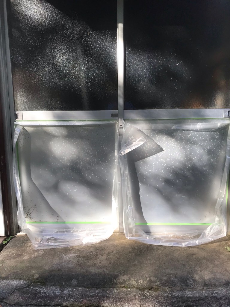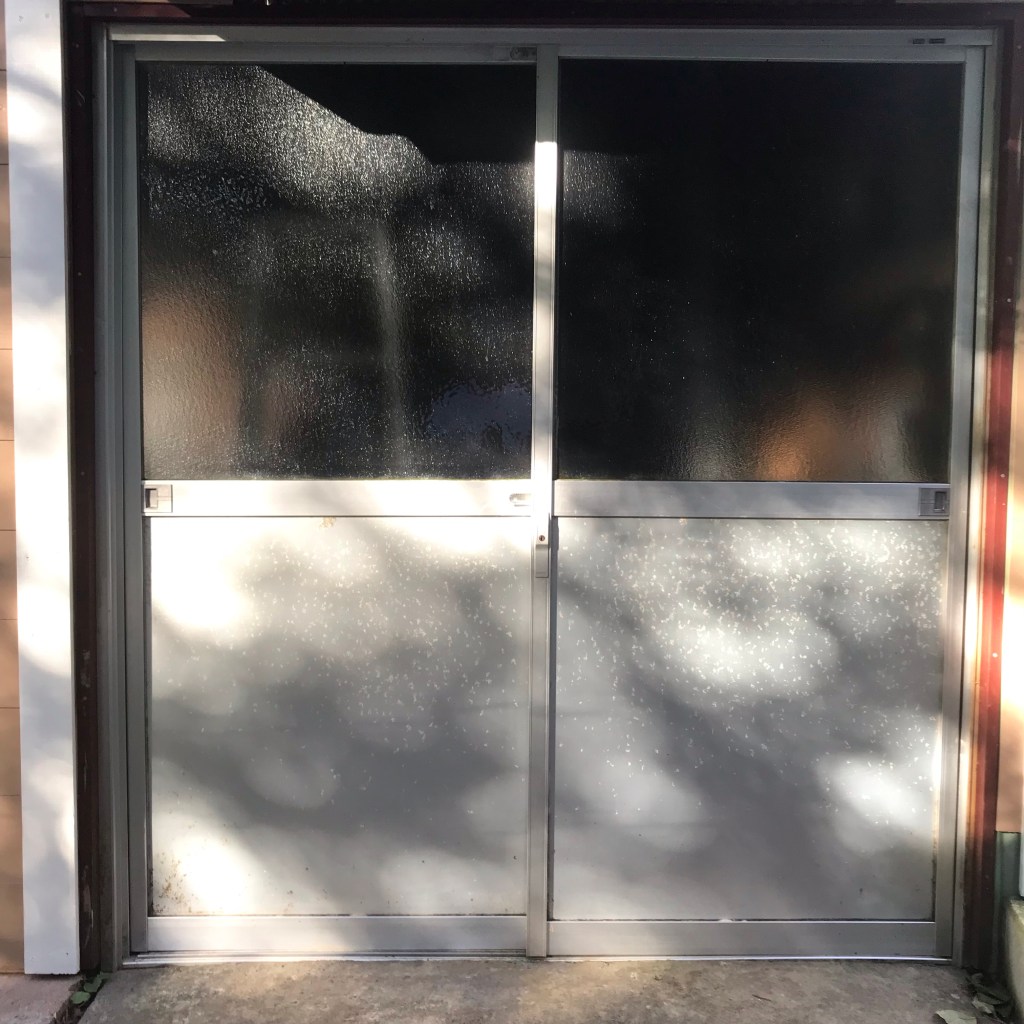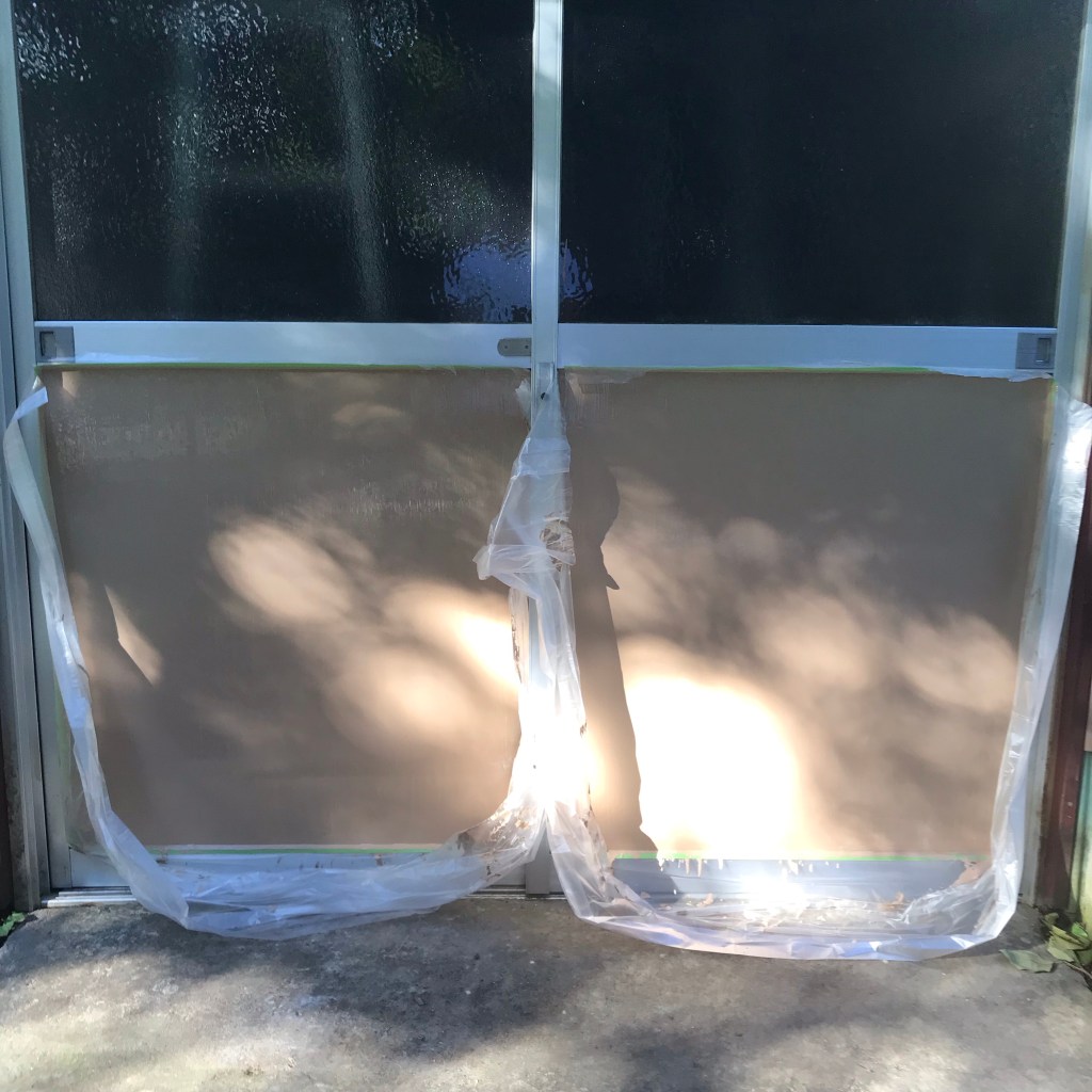 アルミのドアの金属面が気になり、朝起きて取り敢えず周辺と同じ色のペンキを塗ってみることに。
