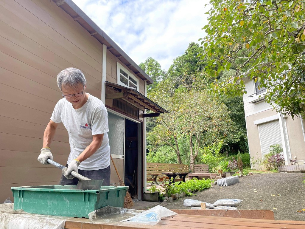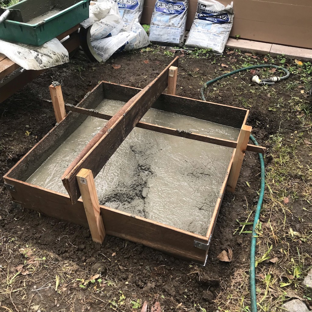 こねるのが大分、楽になりました。18袋ほど一人で流し込んだタイミングでDIY仲間が応援に来てくれて打設完了。1m×1m×25cmです。