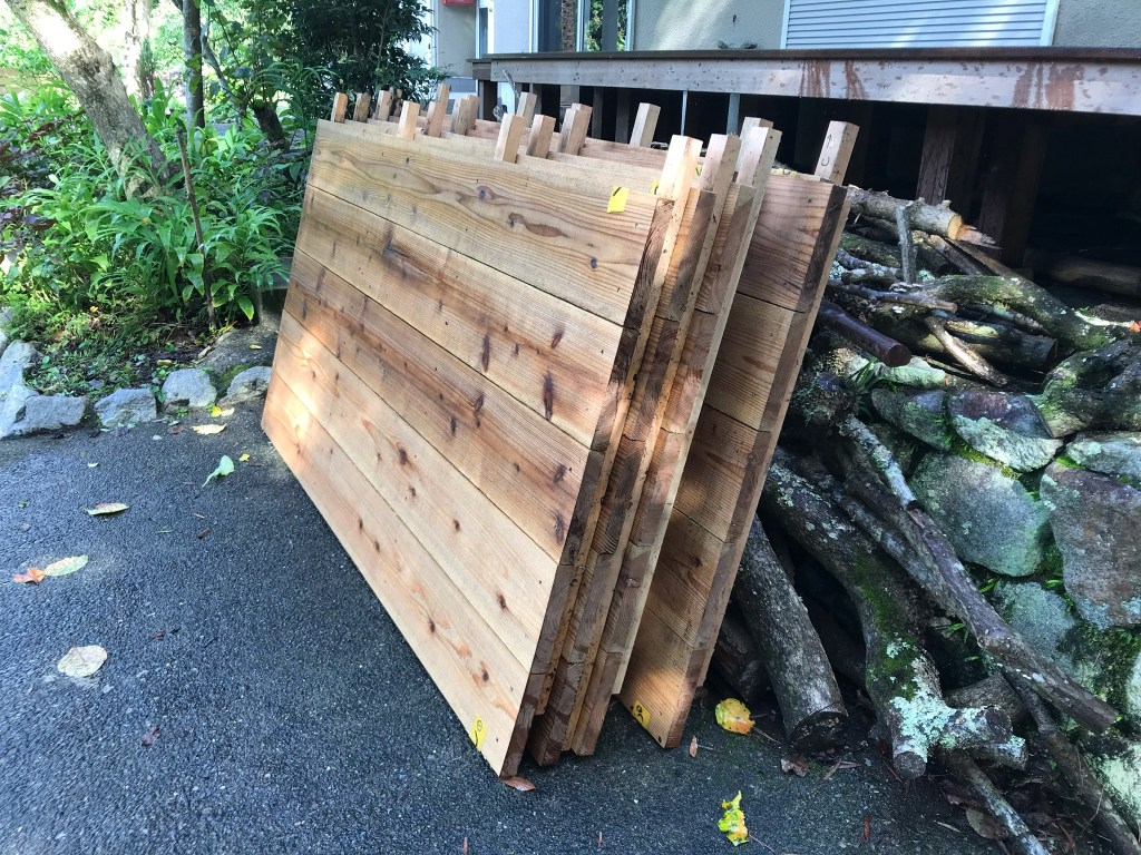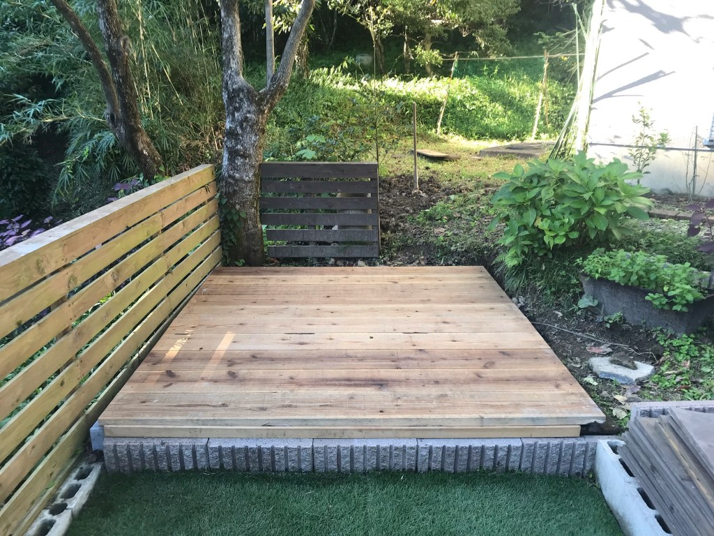 ここ2、3年、庭の整備を進めていますが、草ぼうぼうのままになってる一画があり、以前より気になっていたのですが、丁度良いデッキ材が手に入ったので、コンクリート打設のヘルプに来てくれたDIY仲間とで整備してデッキを敷くことに。