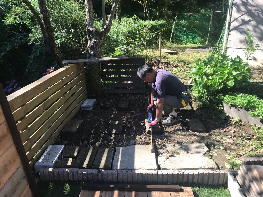 草を刈って整地したところにコンクリートブロックを並べてその上にデッキを置くのですが、土が粘土質なので、高さを揃えるのが至難の業。