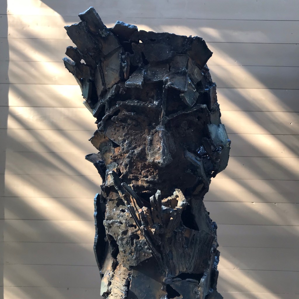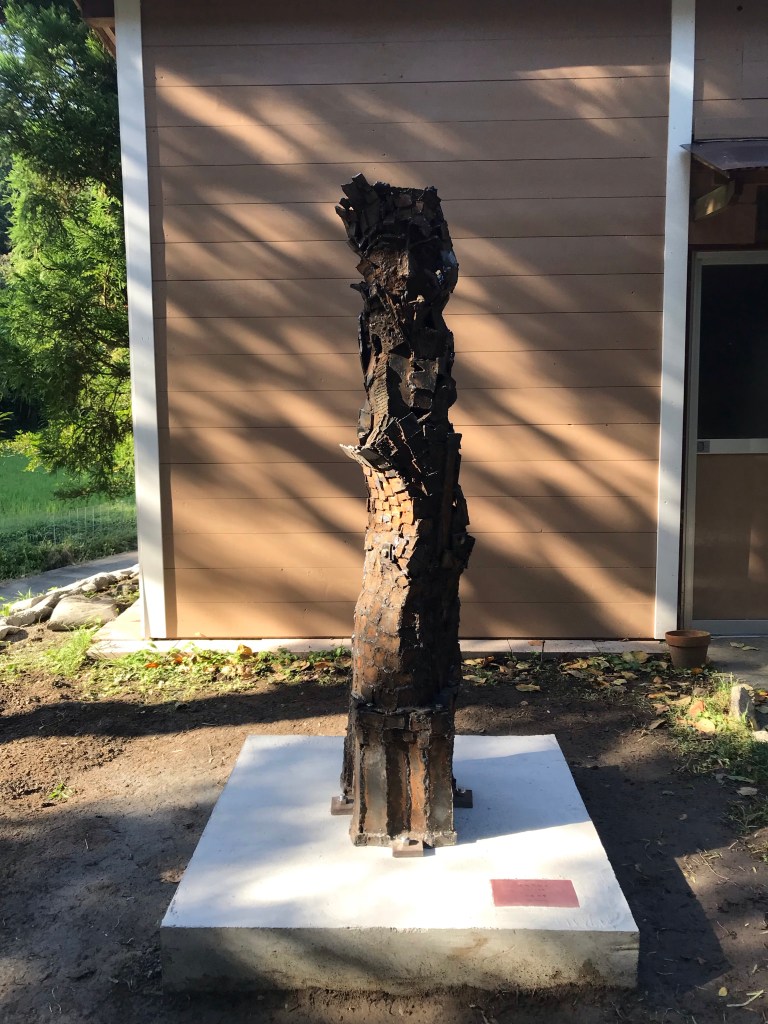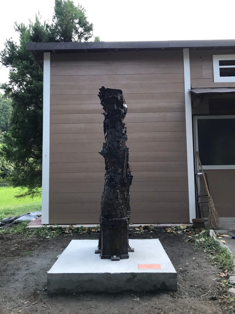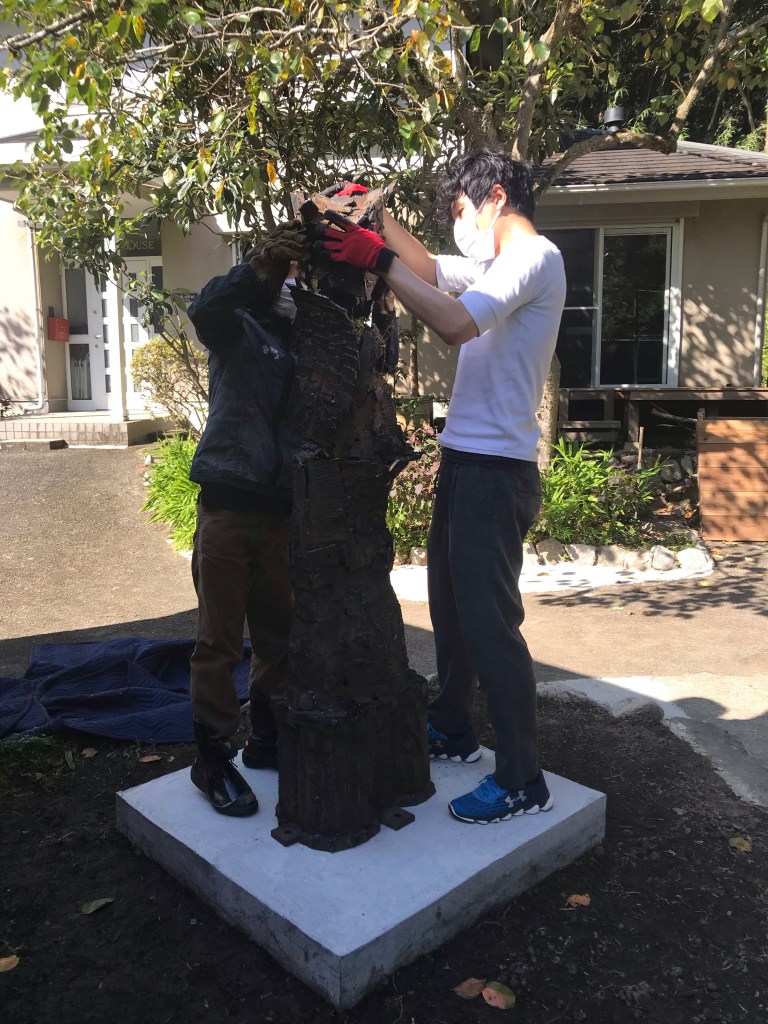 作家さんにあらかじめ設置する場所の写真を送っておいたら、自然豊かな背景をイメージして一見、樹木にも見える、周りに溶け込んだ雰囲気にし、また、とてもカッコいい男性の顔。