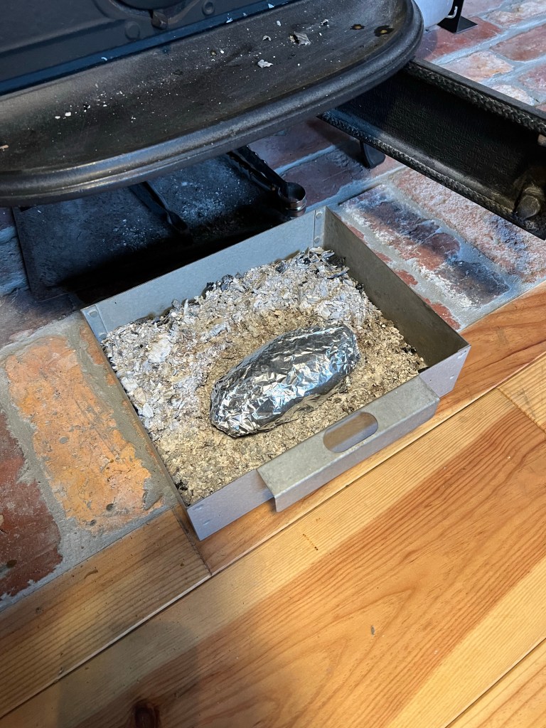灰受けの皿には濡れた新聞紙、アルミホイルで巻いたさつま芋を入れておいて。