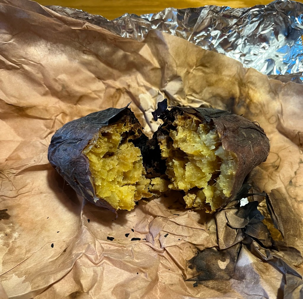 焼き芋の出来上がり。入れっぱなしだったので片面が焦げて硬くなってしまっていました。
