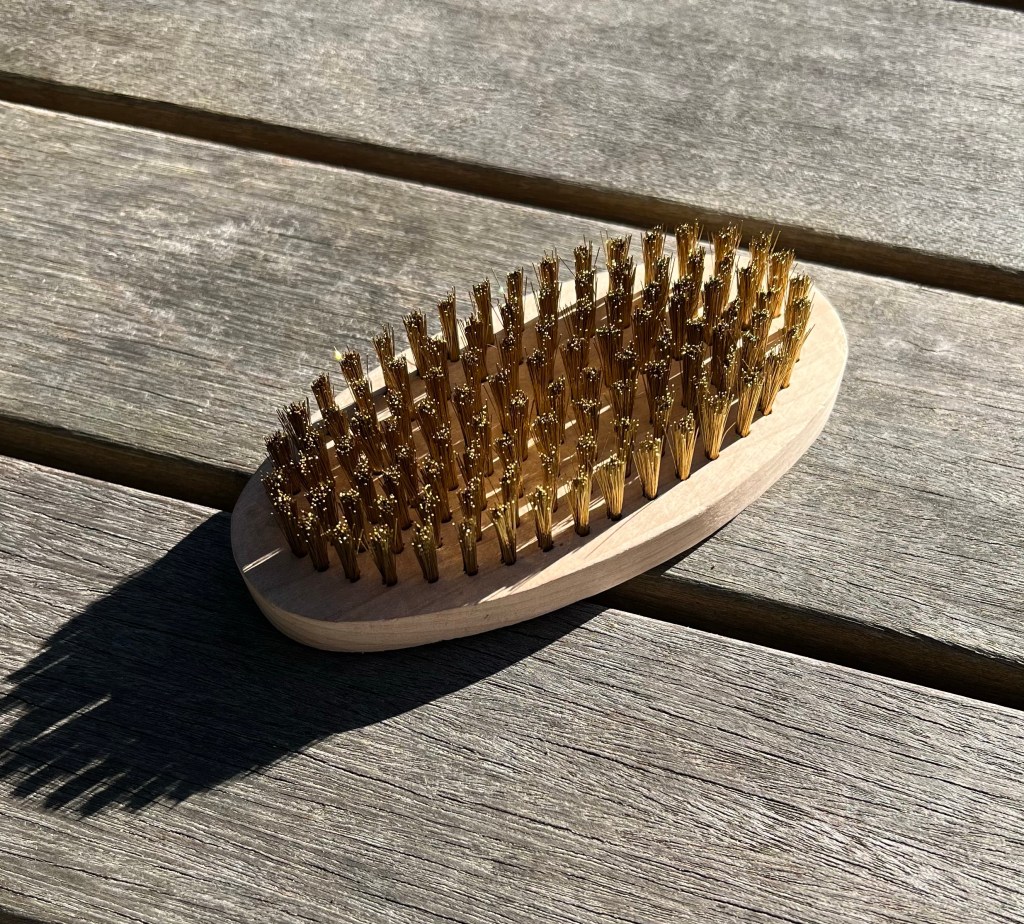 先ずは箒で枯葉などを掃いた後、真鍮のカナブラシで表面を全面ブラッシング。これが結構大変。