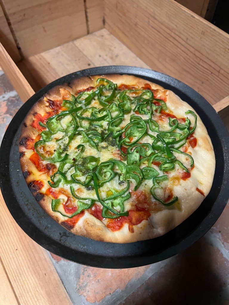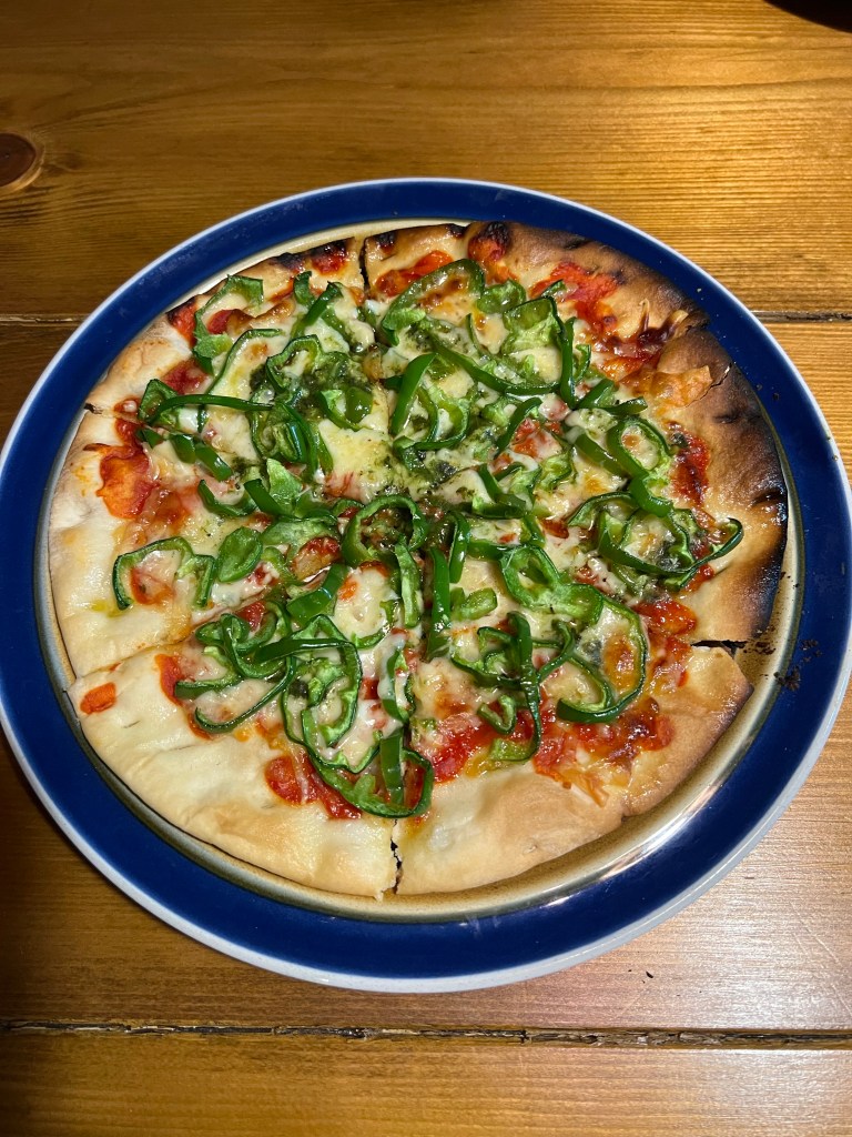 市販のピザだけじゃ寂しいので細切りにした新鮮ピーマンを載せオリーブオイルをたっぷり掛けています。
