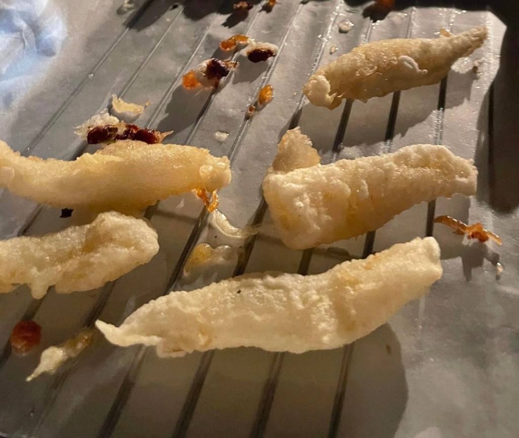 これは刺身用エンガワを揚げたもの。天ぷらは揚げたてが一番。トリュフ塩や梅塩で頂きます。