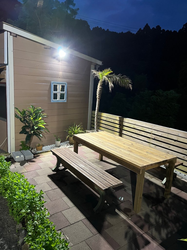 時々、友人達が来てバーベキューや天ぷらパーティーをやる庭。夜は家の中から照明器具を持ち出していましたが、人間の背丈と一緒の高さから光が当たるので人の陰が出来、いまいちでした。
