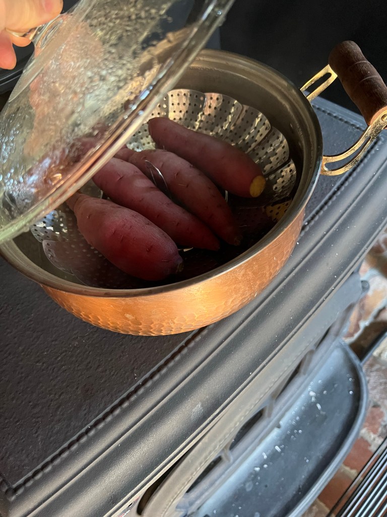 これを水に入れた鍋に置いてその上にさつま芋(紅はるか)を置き、蓋を被せてストーブの家に置いておきます。