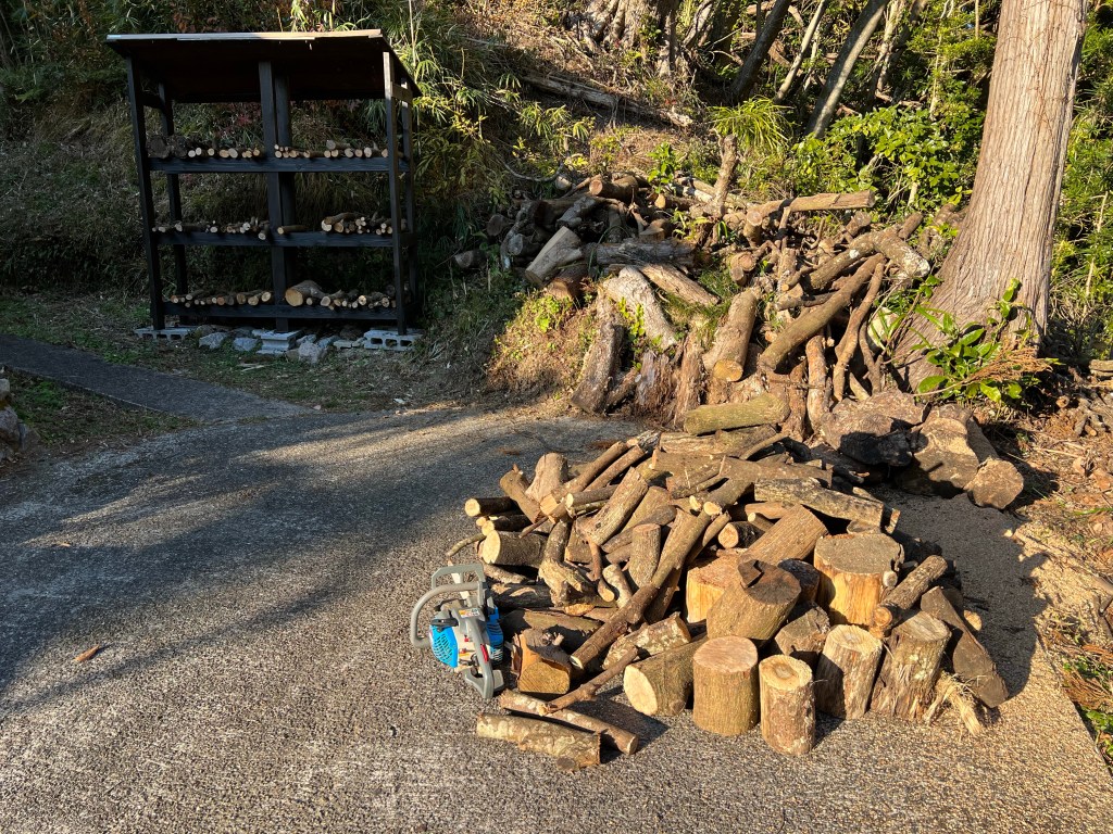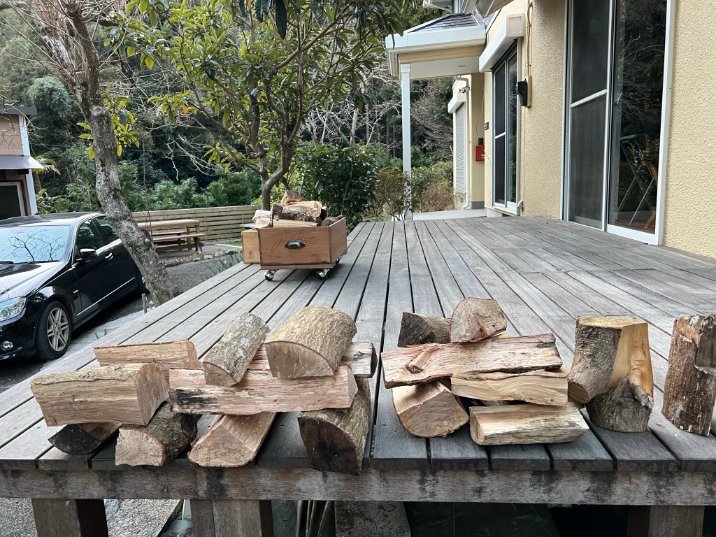午後、暖かい陽射しのもと、この冬後半用の薪作りをしました。